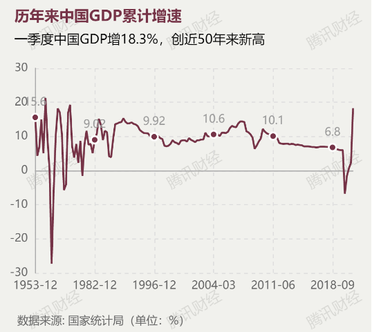 这一增速创下了自1970年以来的最大增幅。1970年,中国经济曾达到19.3%的高速增长,此后中国经济累计增速有54个季度达到两位数,直到2011年左右放缓至个位数左右的速度。