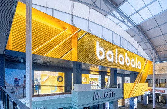 2020年,巴拉巴拉在品牌 logo、产品、营销、门店形象等多方位进行升级,将自己定位为“儿童时尚生活方式品牌”。2020年6月,巴拉巴拉正式启动品牌全新logo,新logo以长方形与圆形进行组合,通过去细节化、扁平化的手法传递给消费者更简约年轻的品牌形象。同时,色彩上选用饱和度更低的PANTONE 135C巴拉黄,赋予品牌更活泼且温暖的视觉表现。从2020年6月起,巴拉巴拉在全国范围内逐步铺开第七代形象门店,新门店围绕产品布局、店铺体验、空间设计等多方位进行升级,打造新型复合零售体验空间,本土特有DNA在门店空间上也有所体现。2020年9月,融入现代科技与传统文化元素的下沙奥莱店落地杭州。店内多处植入“黑科技”电子屏,并与“西冷桥”、“六和塔”等杭州文化标志相结合,打造特色像素风涂鸦外观,构建品牌与地域文化的有机结合。同月,巴拉巴拉首家“独栋”旗舰店在天津全新开业,与其他街边店不同,这家独栋旗舰店建筑立面更自由,整体外观营造出一种现代化和独特感,一开业,就成为天津不少潮人拍照打卡的网红地之一。2020年12月,巴拉巴拉上海环球港、西安赛格、无锡苏宁广场、广州番禺天河城四店同开,其中无锡苏宁广场店首次在设计中植入“星际旅行”概念,中心区域设置宇宙感空间,并结合星际元素深化主题,构建情景式门店空间;聚焦新生儿产品的上海环球港店,以象征新生的蛋壳元素与更活泼的嫩黄色彩构建门店视觉空间,同时设置母婴室,传达新生定位及品牌呵护理念。产品方面,巴拉巴拉2020年推出原创形象“小章鱼”及系列产品,以及推出与“冰雪奇缘”、 “汪汪队”、 “大闹天宫”、 “敦煌博物馆”、 “梵高博物馆”等知名 IP 合作款产品三、剥离法国童装集团 Kidiliz