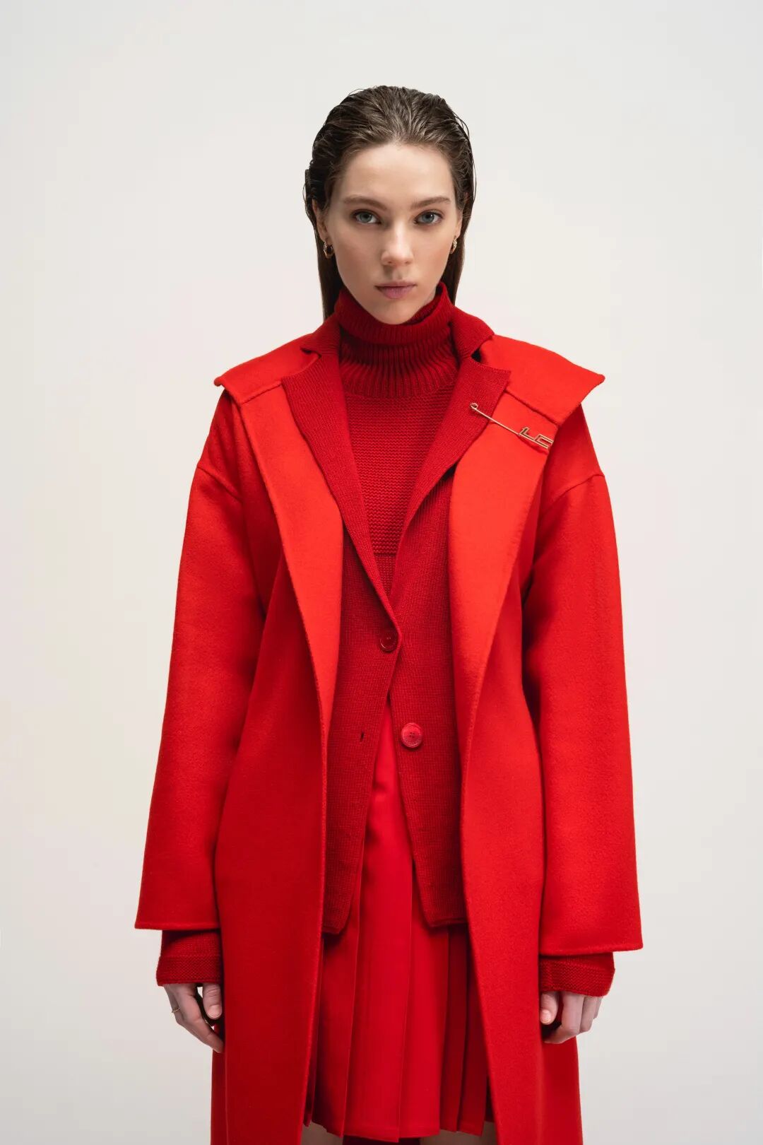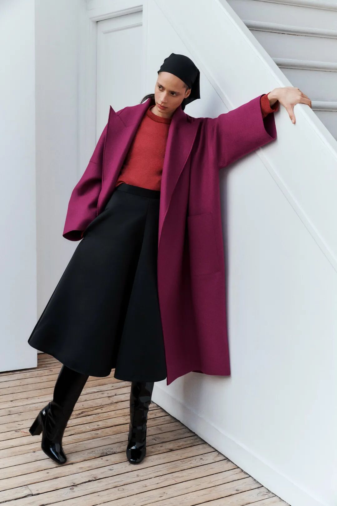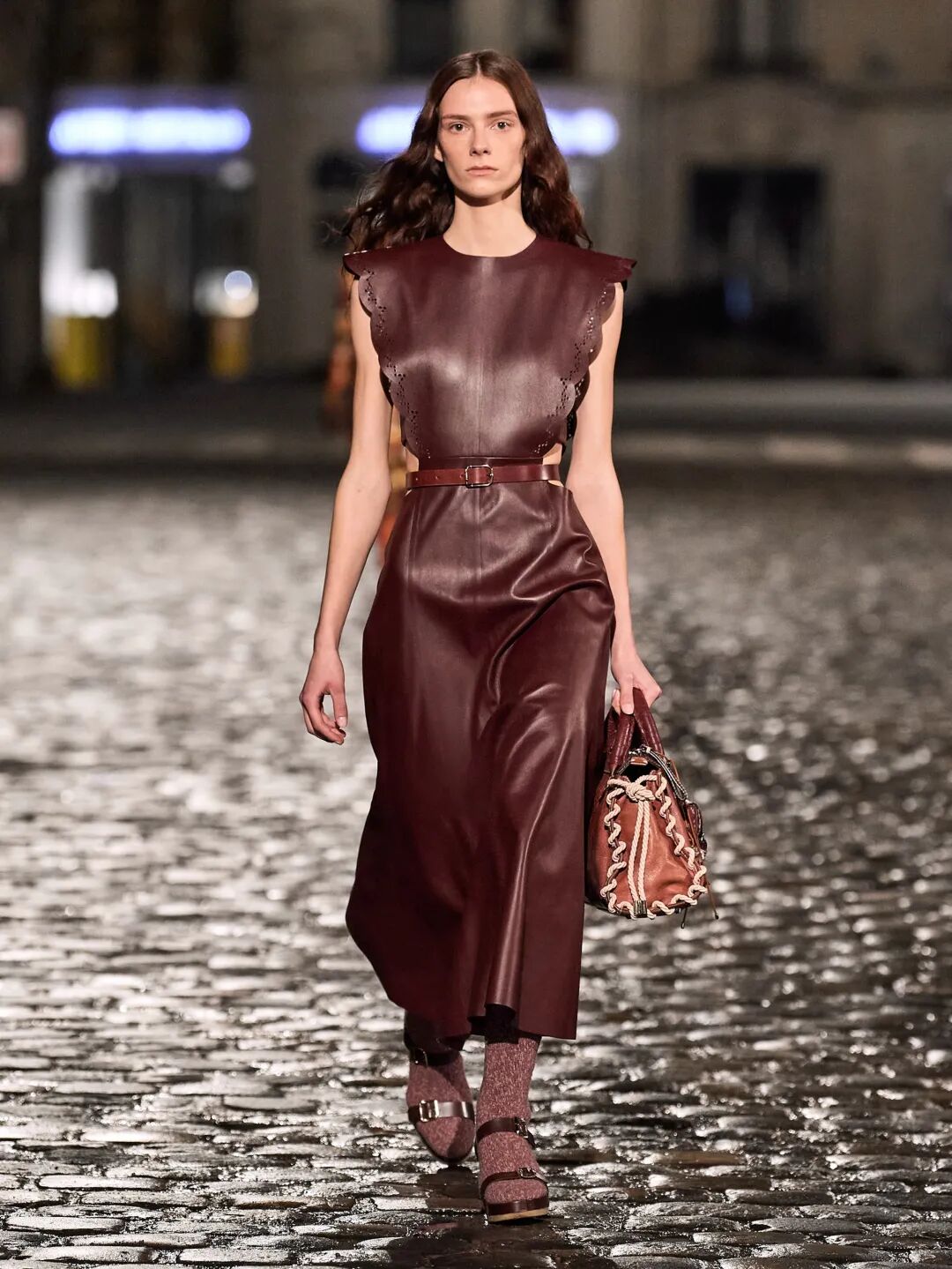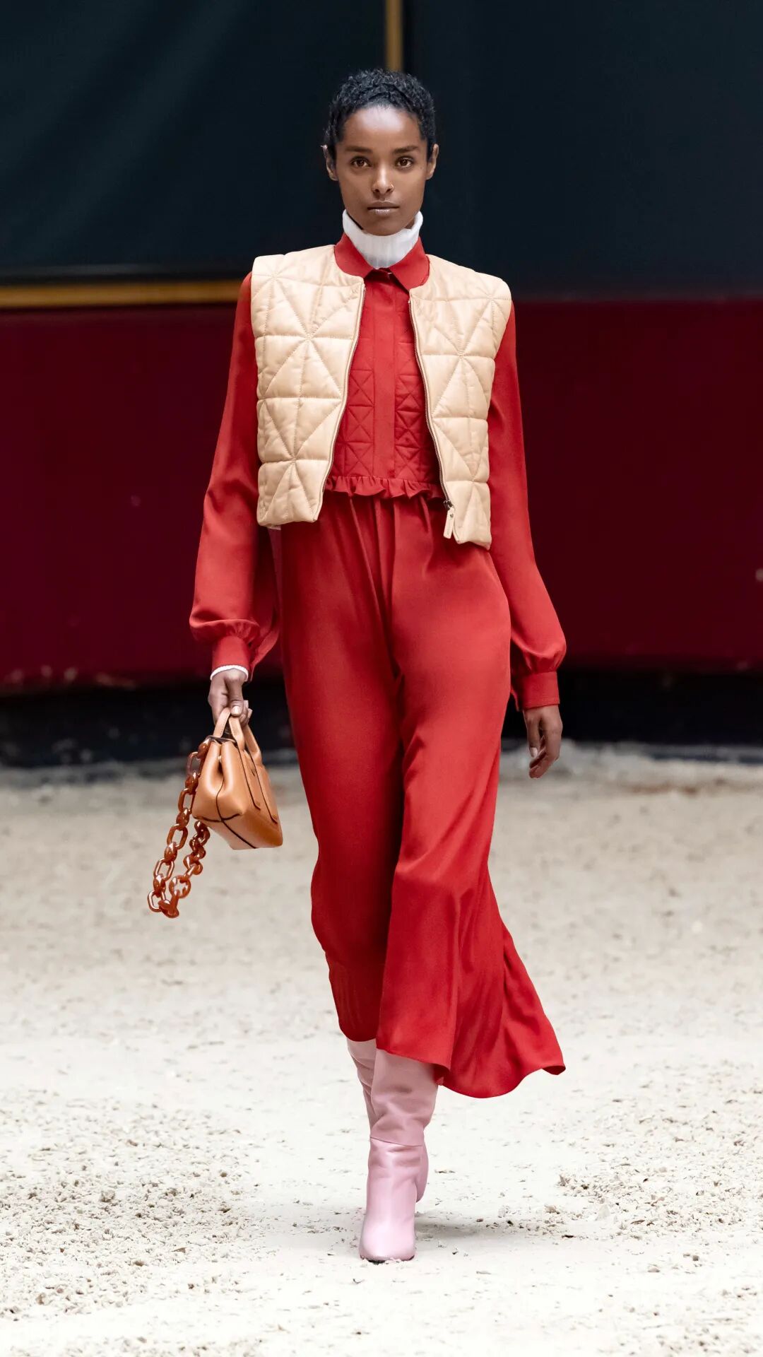 着眼连衣裙与外套款式,使用学院红以塑造视觉冲击力。单色调设计仍然极为关键,而表面纹理则有助于增加层次感。