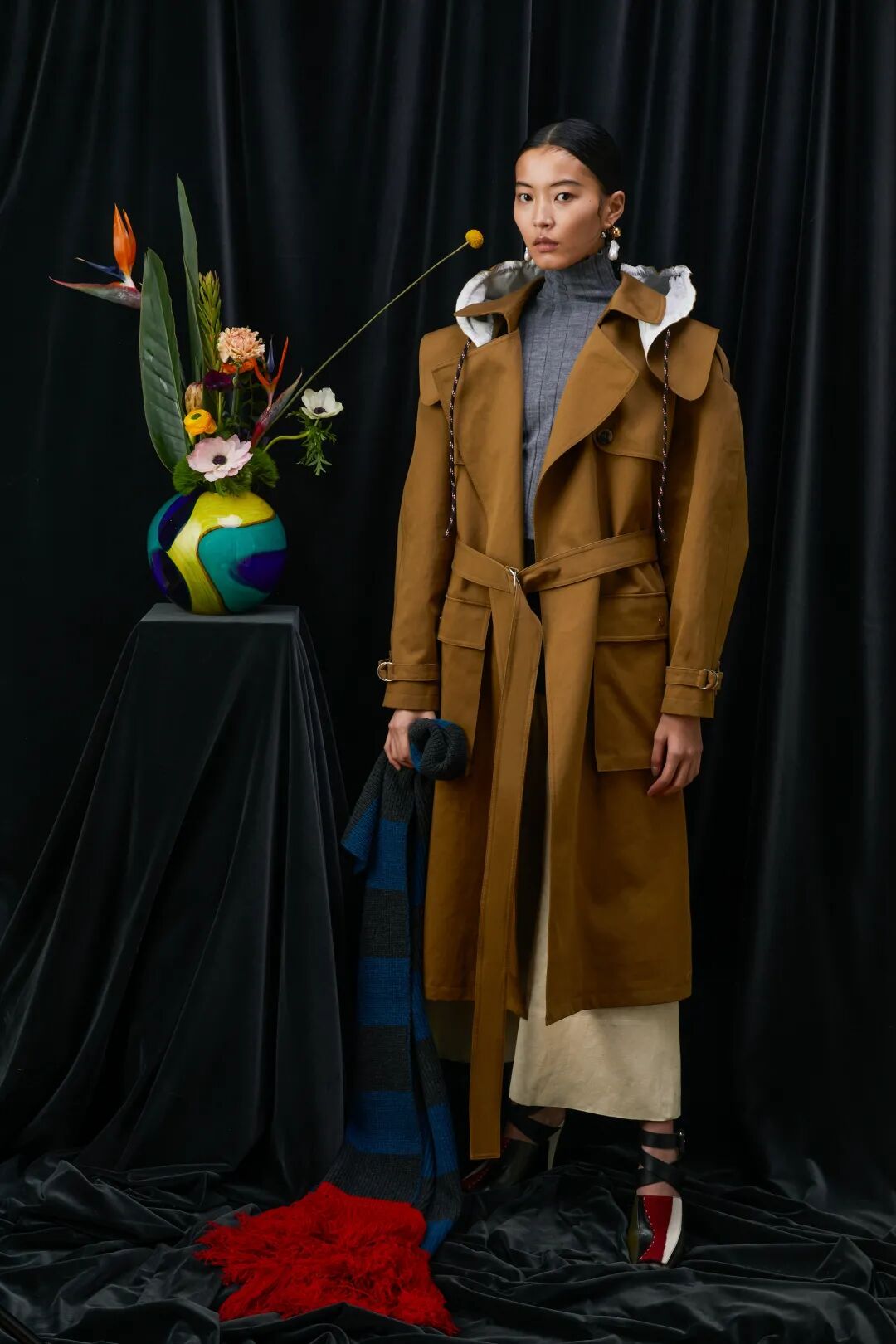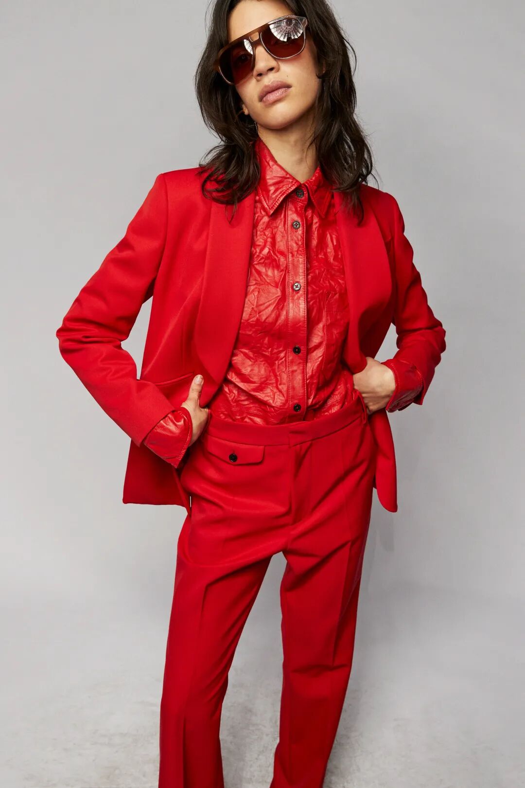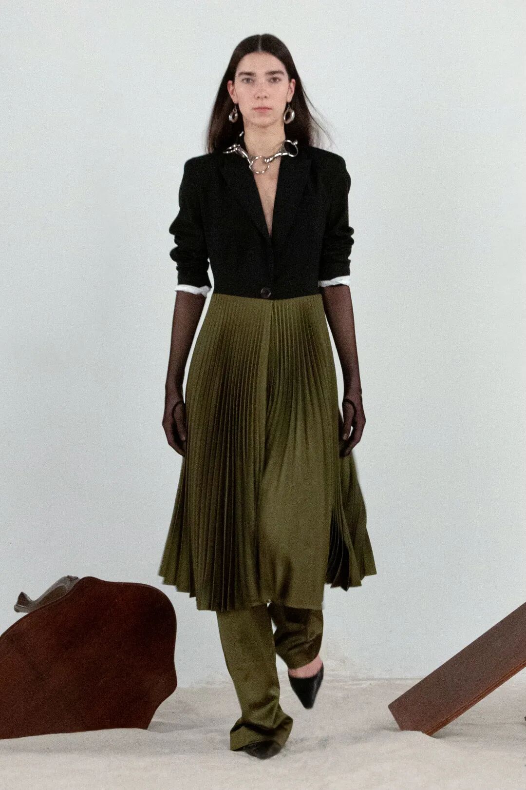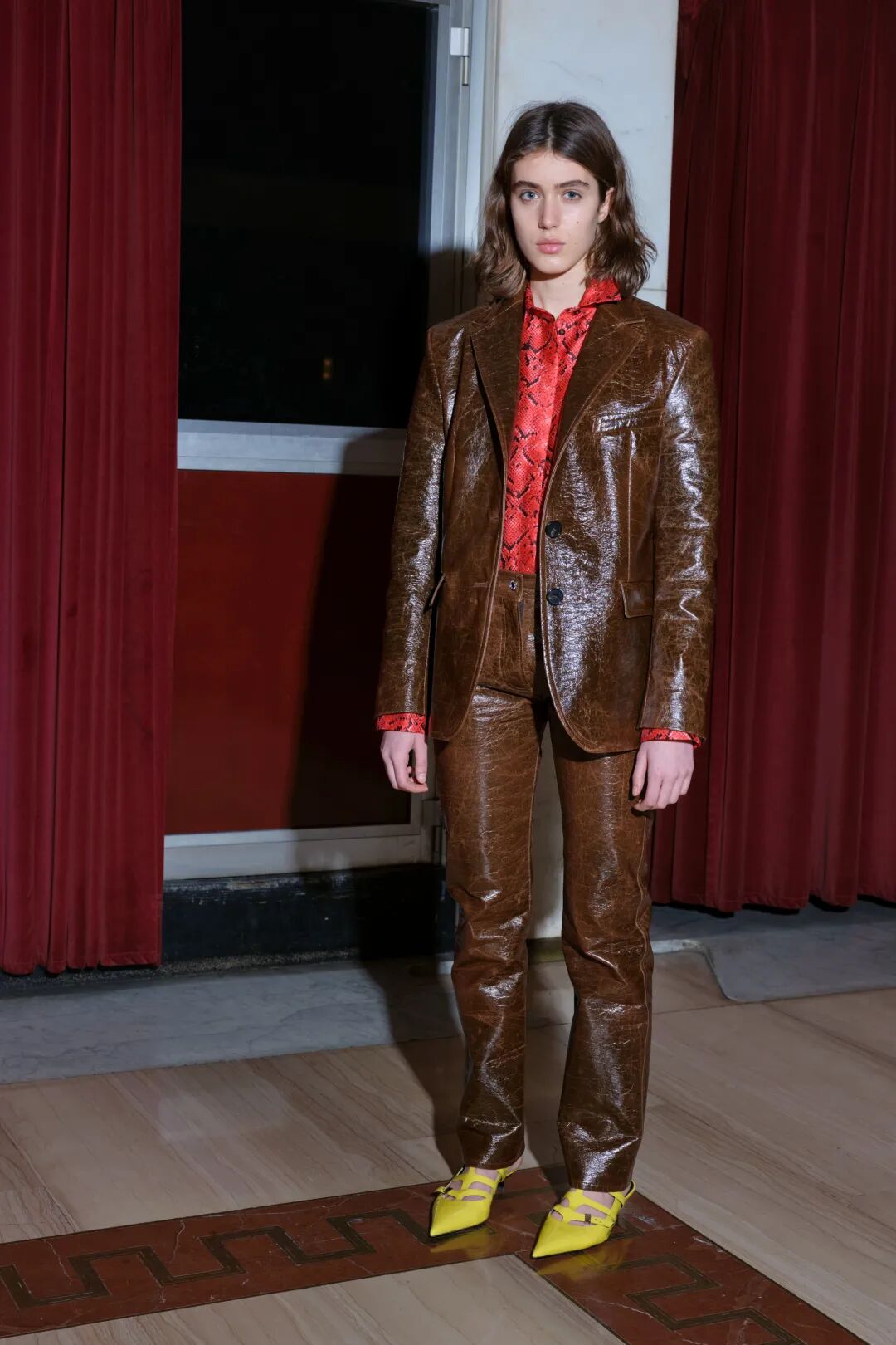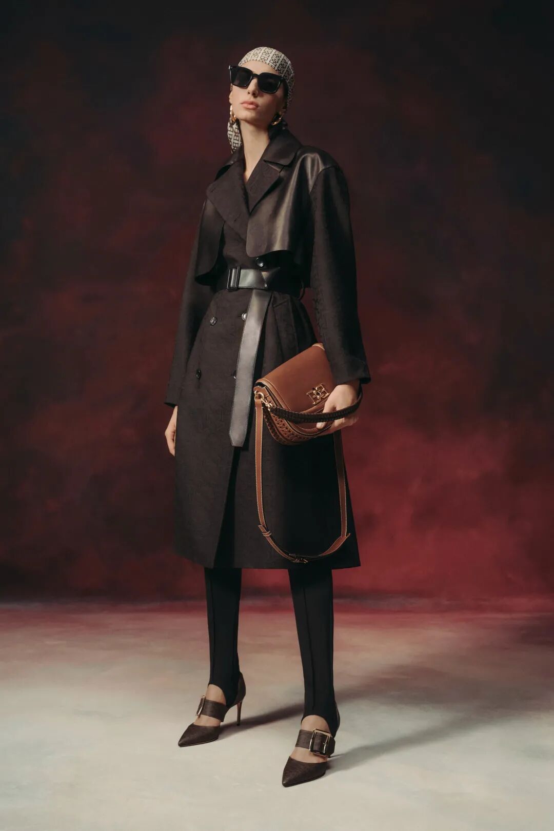 着眼连衣裙与外套款式,使用学院红以塑造视觉冲击力。单色调设计仍然极为关键,而表面纹理则有助于增加层次感。
