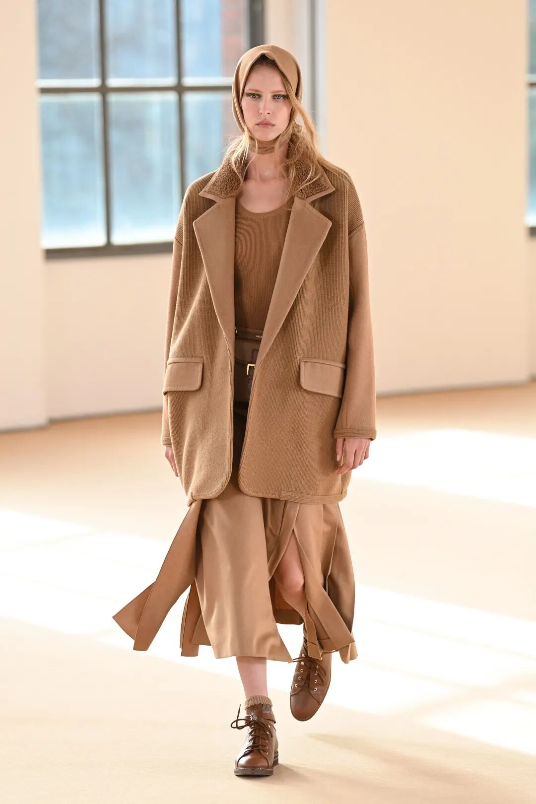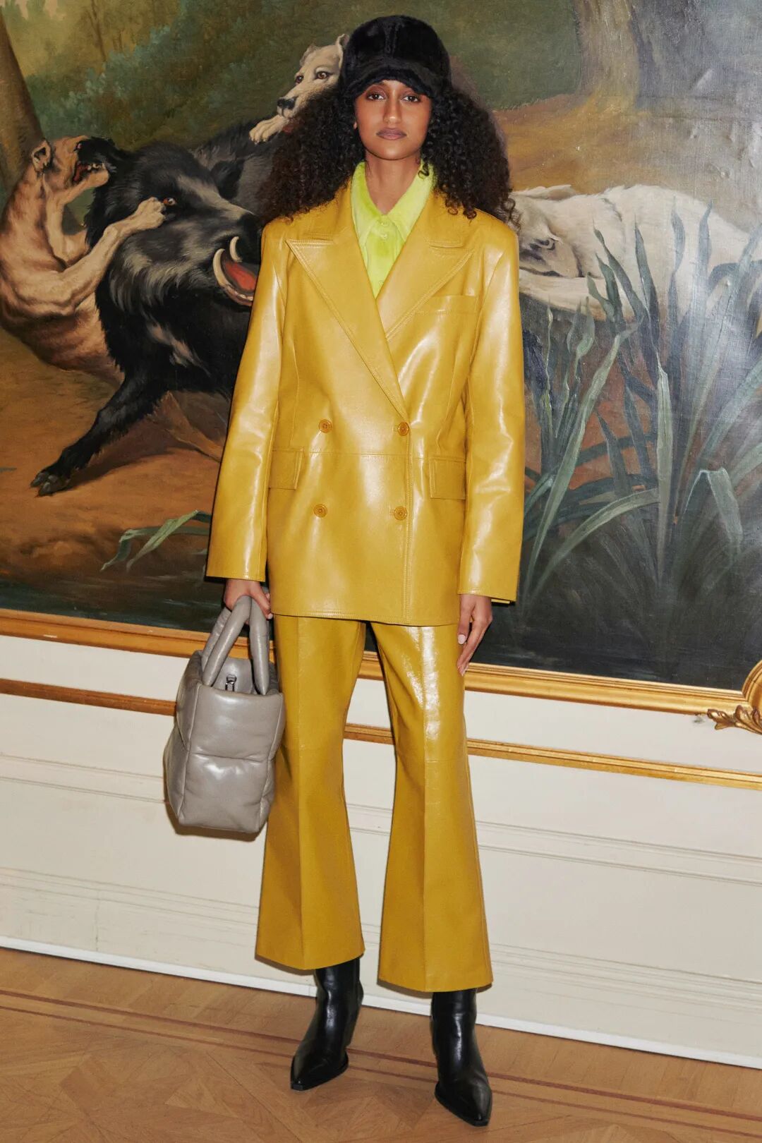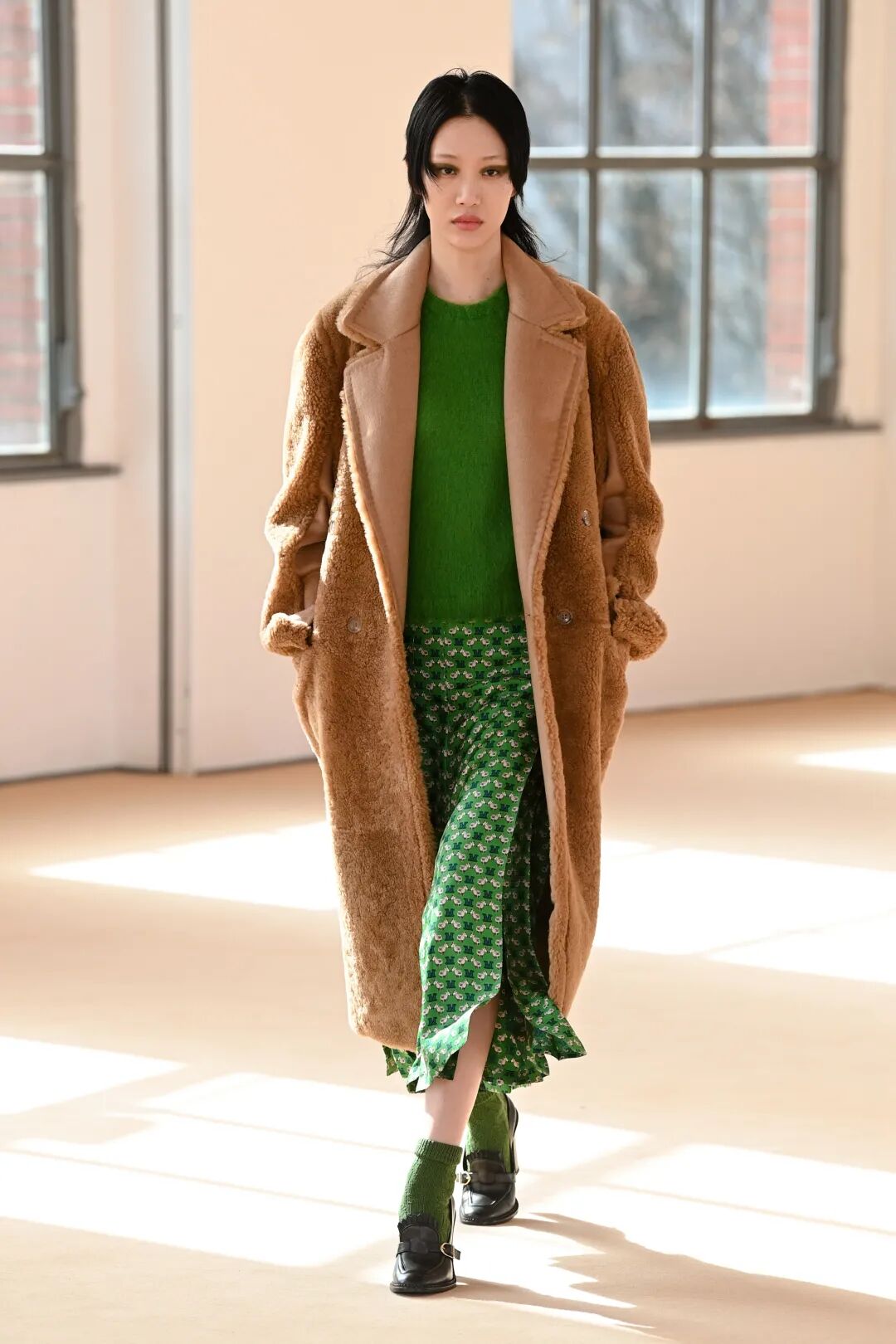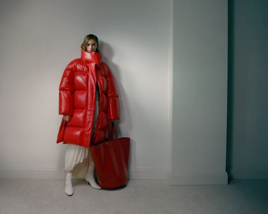 着眼连衣裙与外套款式,使用学院红以塑造视觉冲击力。单色调设计仍然极为关键,而表面纹理则有助于增加层次感。