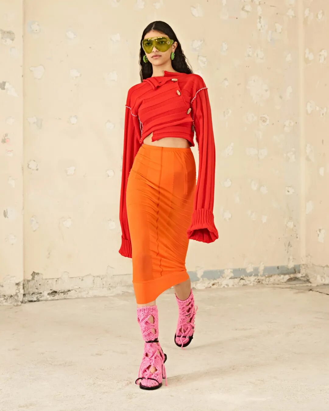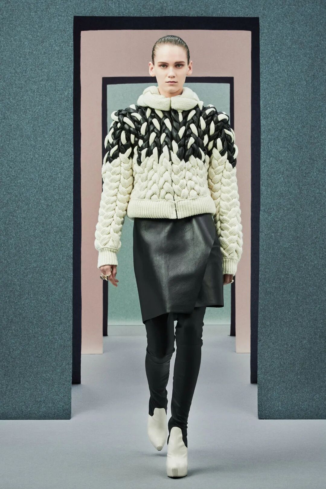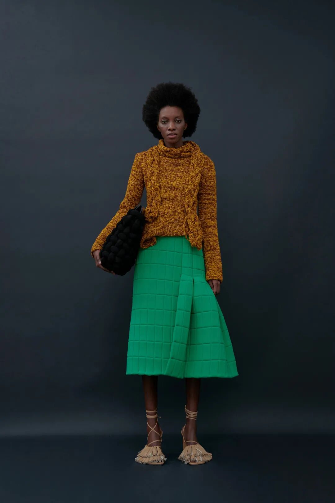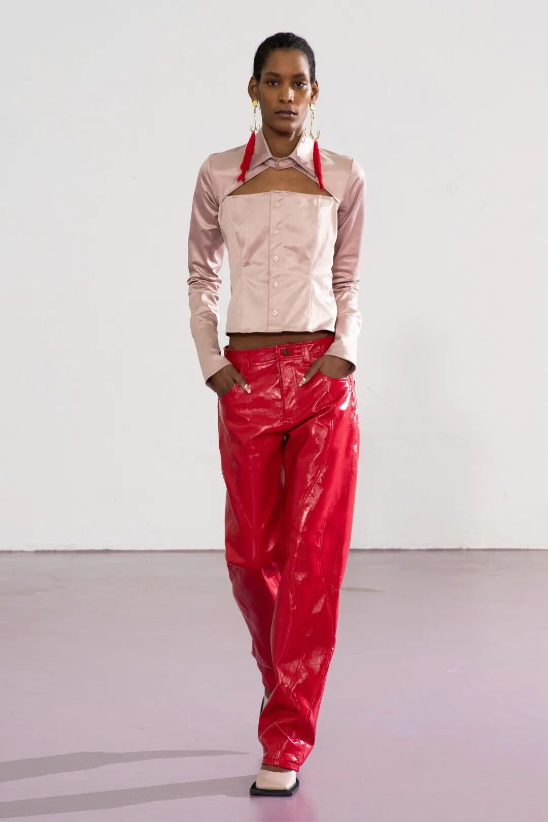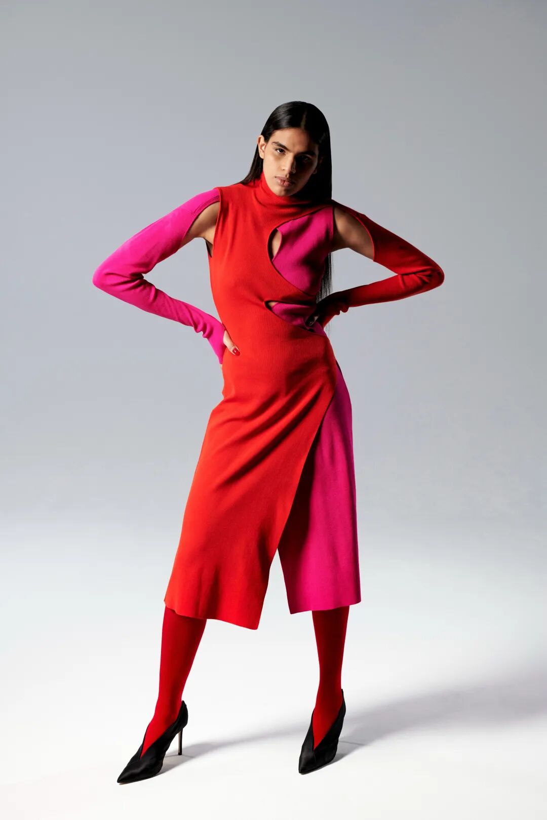 着眼连衣裙与外套款式,使用学院红以塑造视觉冲击力。单色调设计仍然极为关键,而表面纹理则有助于增加层次感。