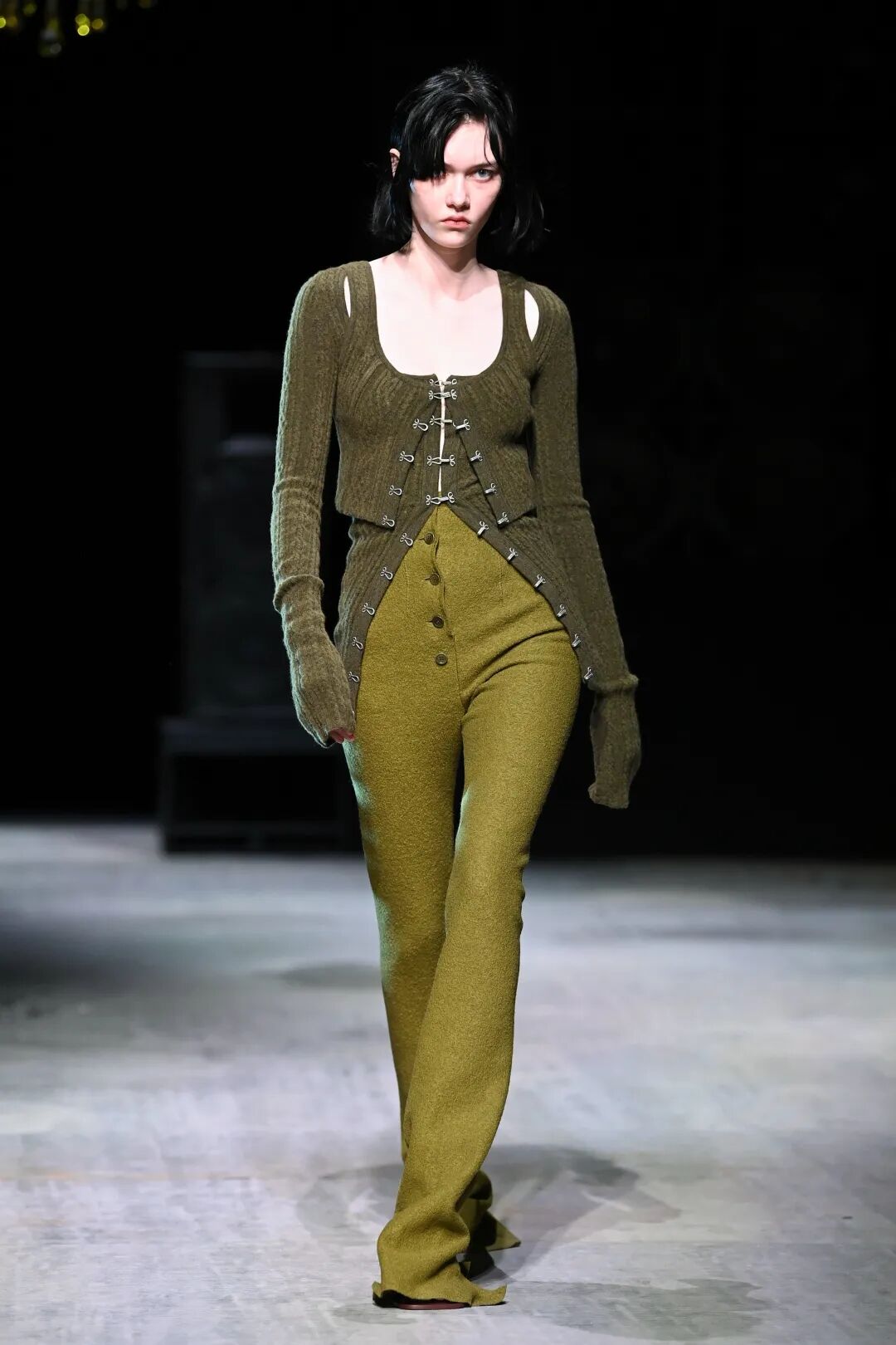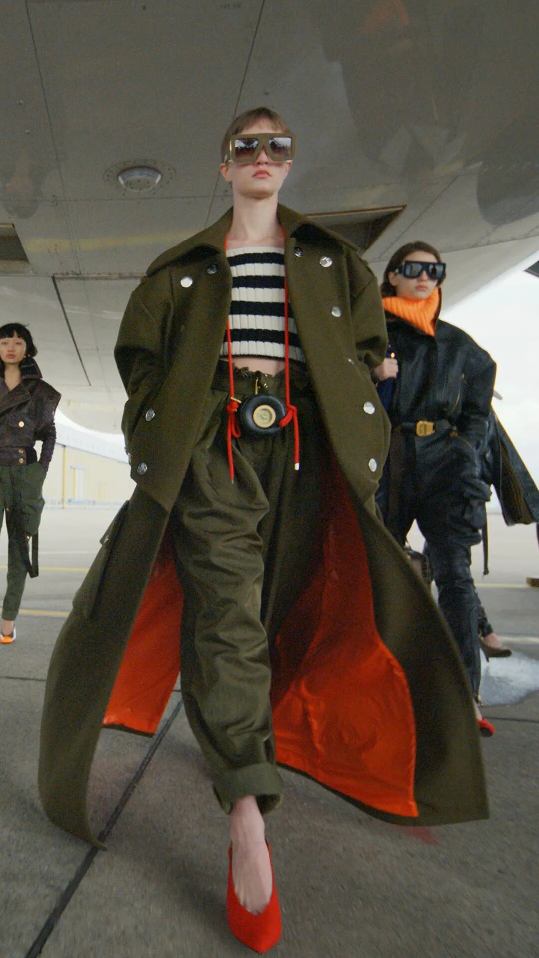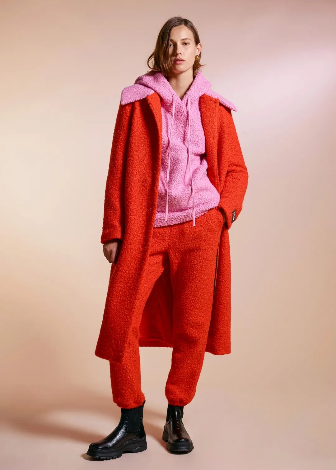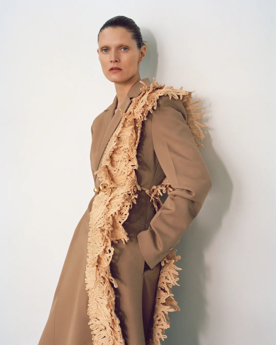 着眼连衣裙与外套款式,使用学院红以塑造视觉冲击力。单色调设计仍然极为关键,而表面纹理则有助于增加层次感。