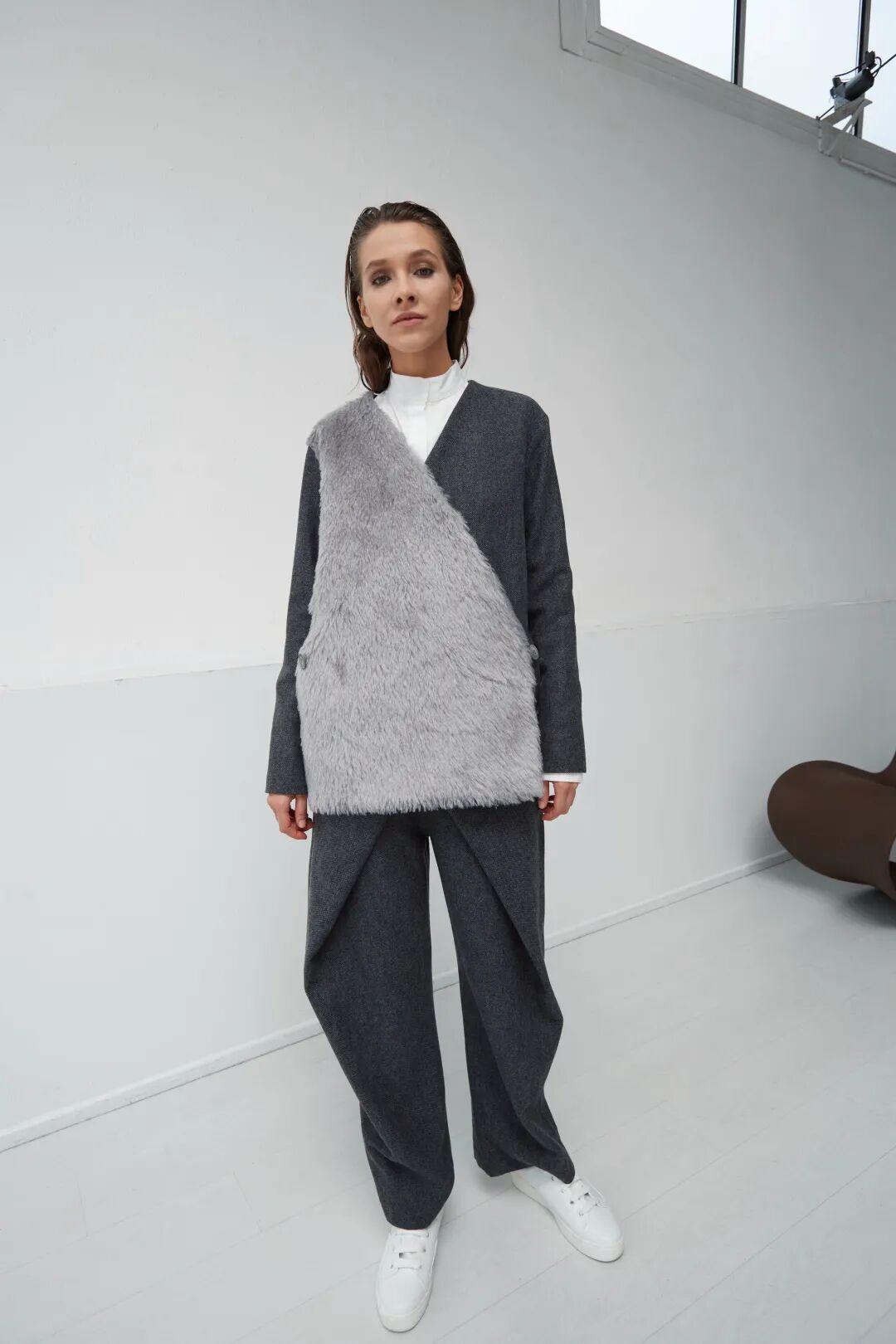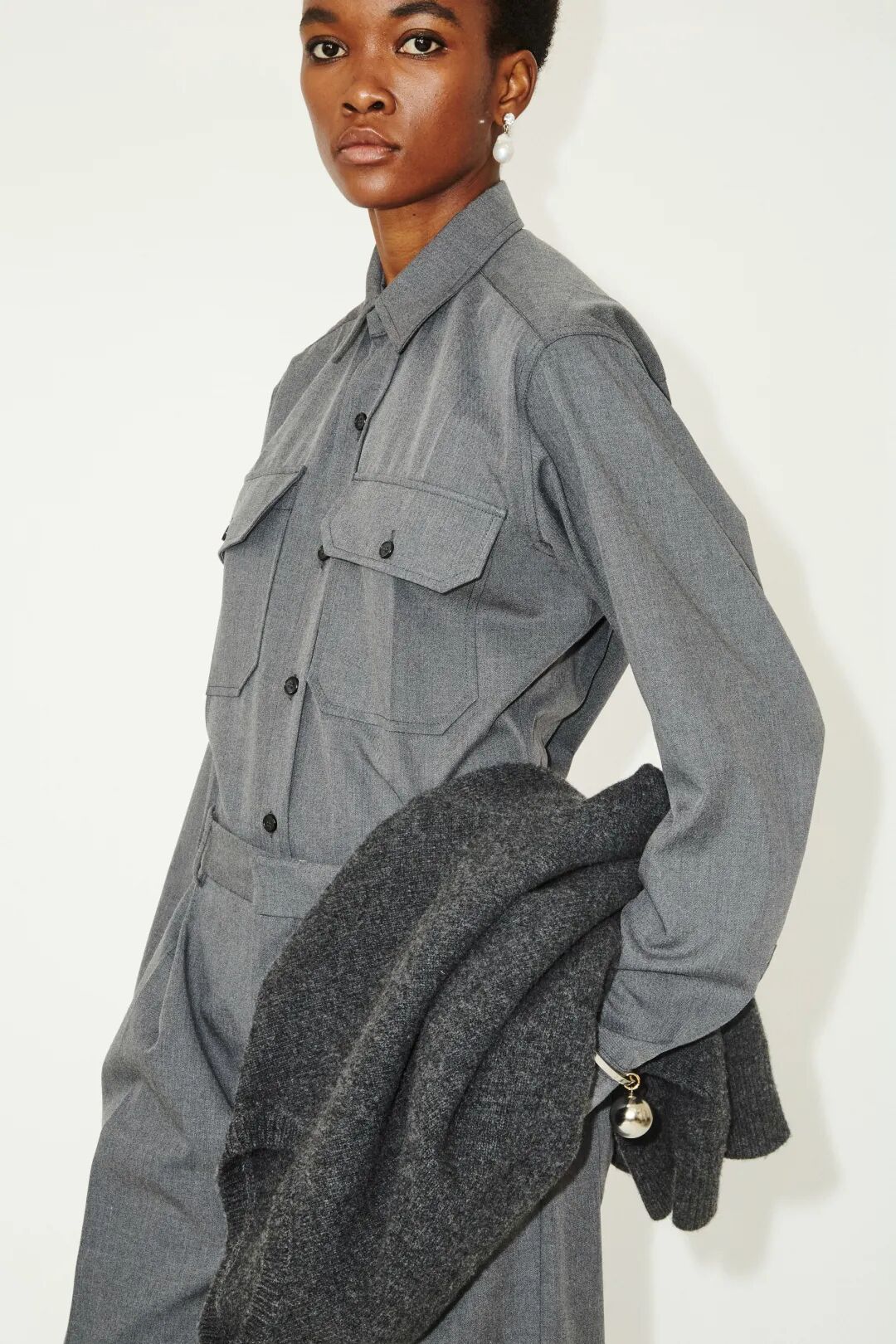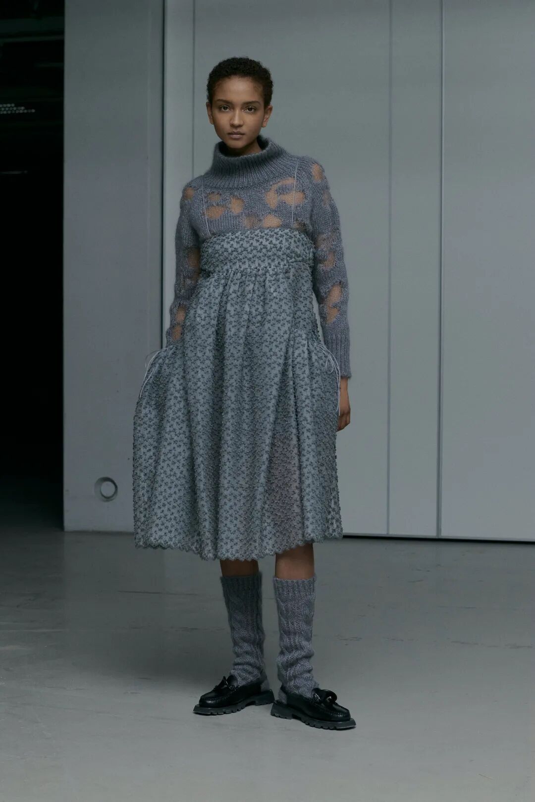 搭配连衣裙、上衣、下装以及柔软洋裁夹克。该色调适用于极致舒适主题与#办公休闲款式,使用斑点状的黑白杂花纱线则可添加纹理感。建议运用灰配灰设计,将浅灰色与中灰色相叠搭。