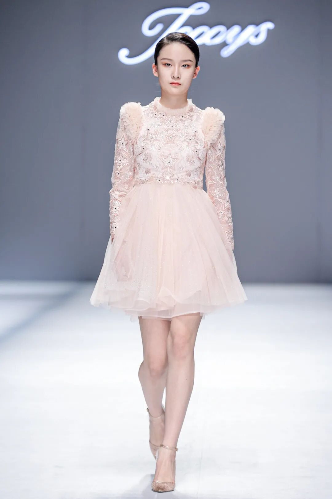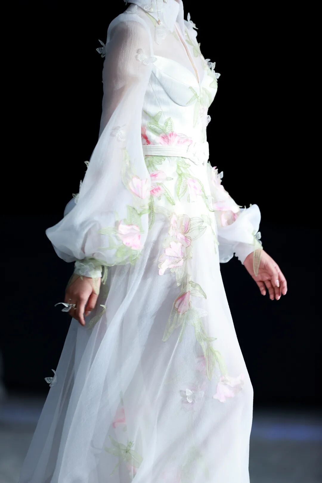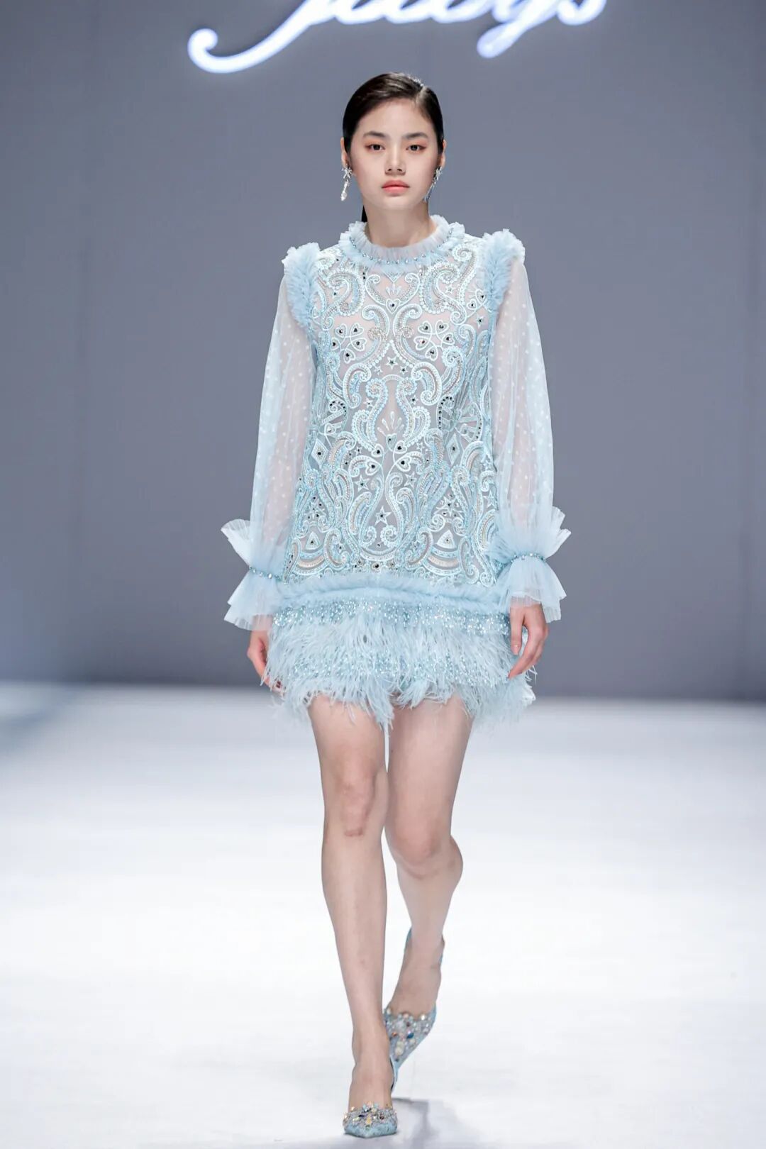 盖娅传说服饰基于中国非遗工艺和西式轮廓剪裁,把国风艺术运用到服装里,致力于将中国传统文化转化为独特的服饰美学,本季设计中引用到苏绣、纳纱绣、打籽绣、金丝绣、盘金绣等中国传统刺绣工艺,诠释非遗工艺设计之美。