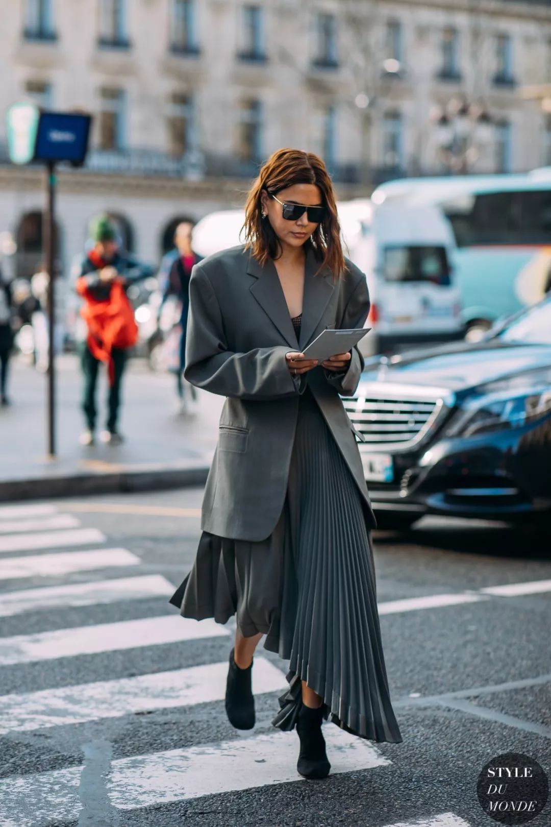 百褶裙是克制的,所以它适合和剪裁利落的西装搭配,显得人特别有精神!