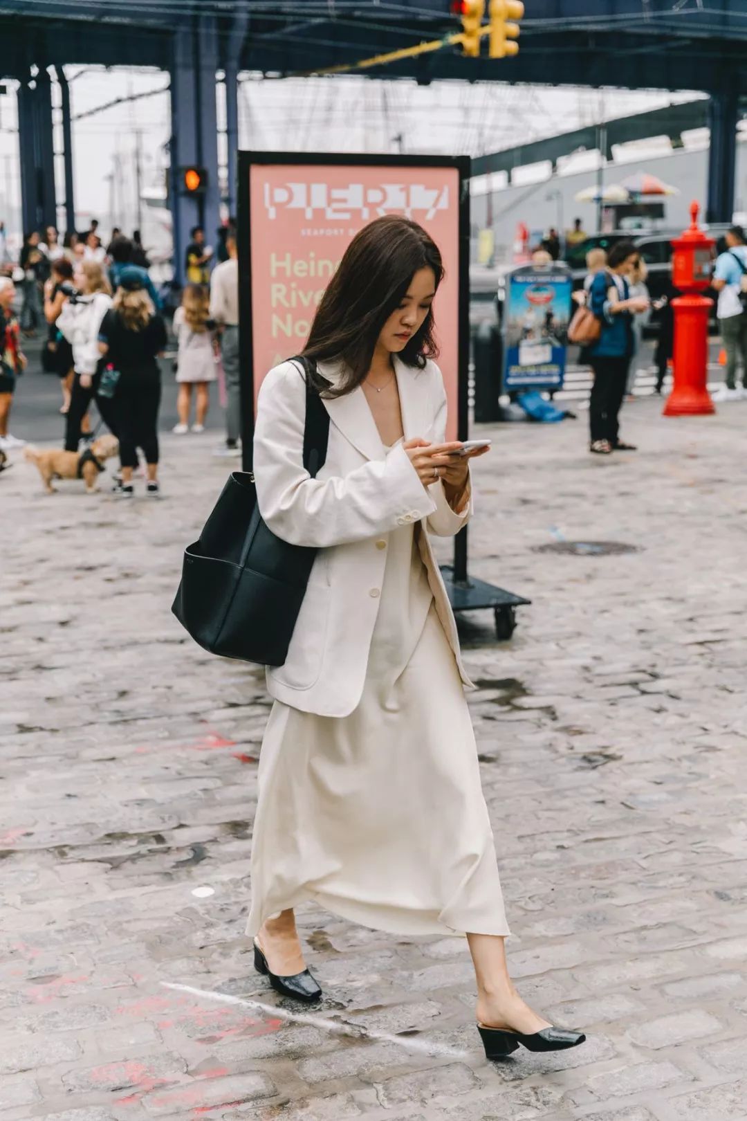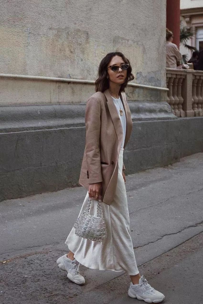 仙女裙,其实指的就是材质轻薄飘逸的裙子,多以纱裙为主,早秋用它搭西装,既不失温度,还能保持搭配的清爽感。