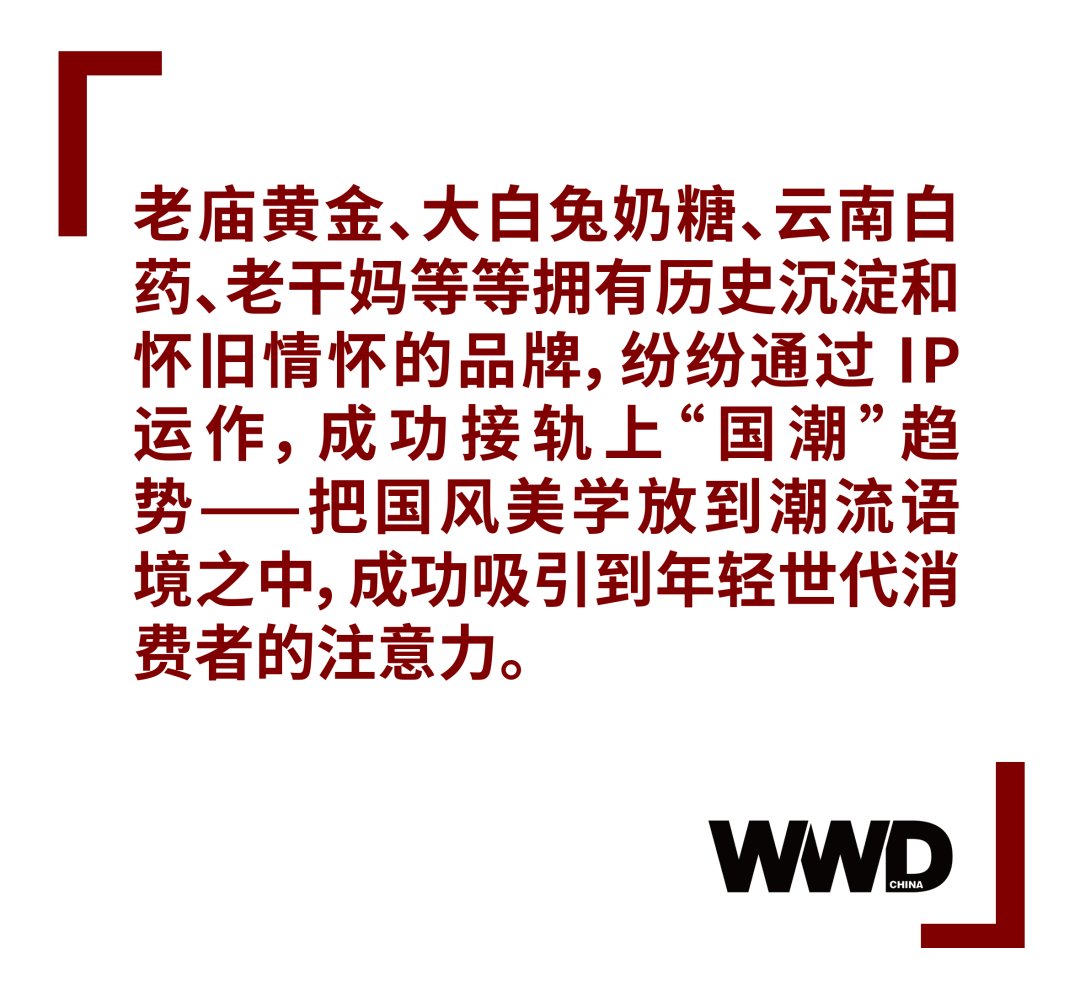 复盘近几年的老字号蜕变潮,“国潮”二字是最重要的发展线索。2018 年,已经实现扭亏为盈的李宁,首次出海登上纽约时装周,让“中国李宁”和红黄配色成为中国千禧一代心目中的国货之光,并让这一代对政治相对冷感的年轻消费群体燃起了浓厚的爱国情怀;600 岁的故宫是“国潮”的代表性 IP,它把自己打造成一个联名机器,靠着横跨多个产品领域的 IP 联名迅速出圈走红,而接连举办的多场国际品牌时尚活动,则让故宫在《末代皇帝》之后再次成为一个国际性的 IP 代表;老庙黄金、大白兔奶糖、云南白药、老干妈等等拥有历史沉淀和怀旧情怀的品牌,纷纷通过 IP 运作,成功接轨上“国潮”趋势——把国风美学放到潮流语境之中,成功吸引到年轻世代消费者的注意力。