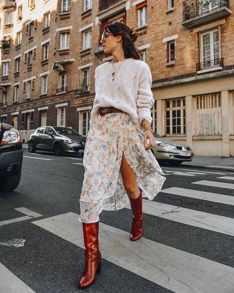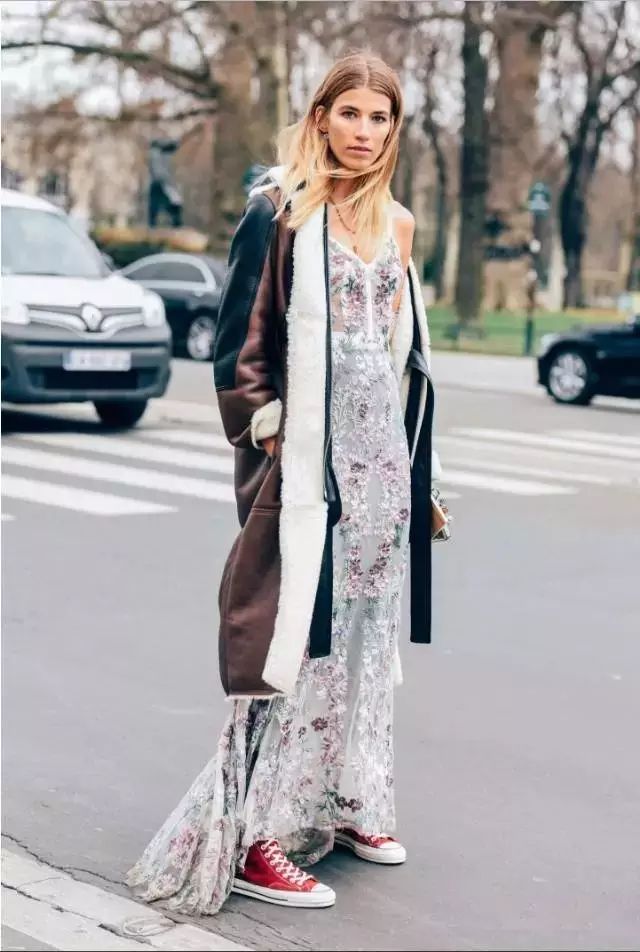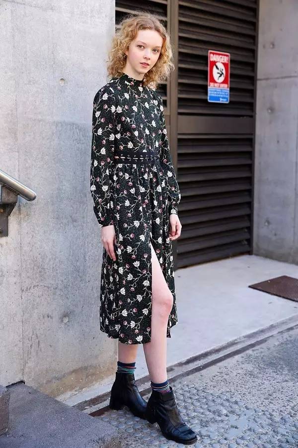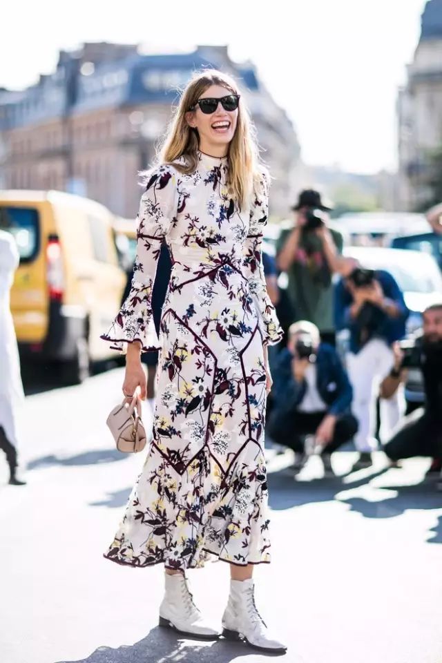 印花最美是长裙!烂漫的印花和长裙组成CP,仙气飘飘,美得撩人~今春怎么也不能少了一件它。如果不喜欢太过密集的印花图案,可以选择这种图案间距相对比较大的款式。浅蓝色或淡粉色作为印花裙的底色,也大都非常清新养眼。印花连衣长裙搭配短靴,柔中带酷,穿出少女范儿~等天气回温就能这么上阵了。