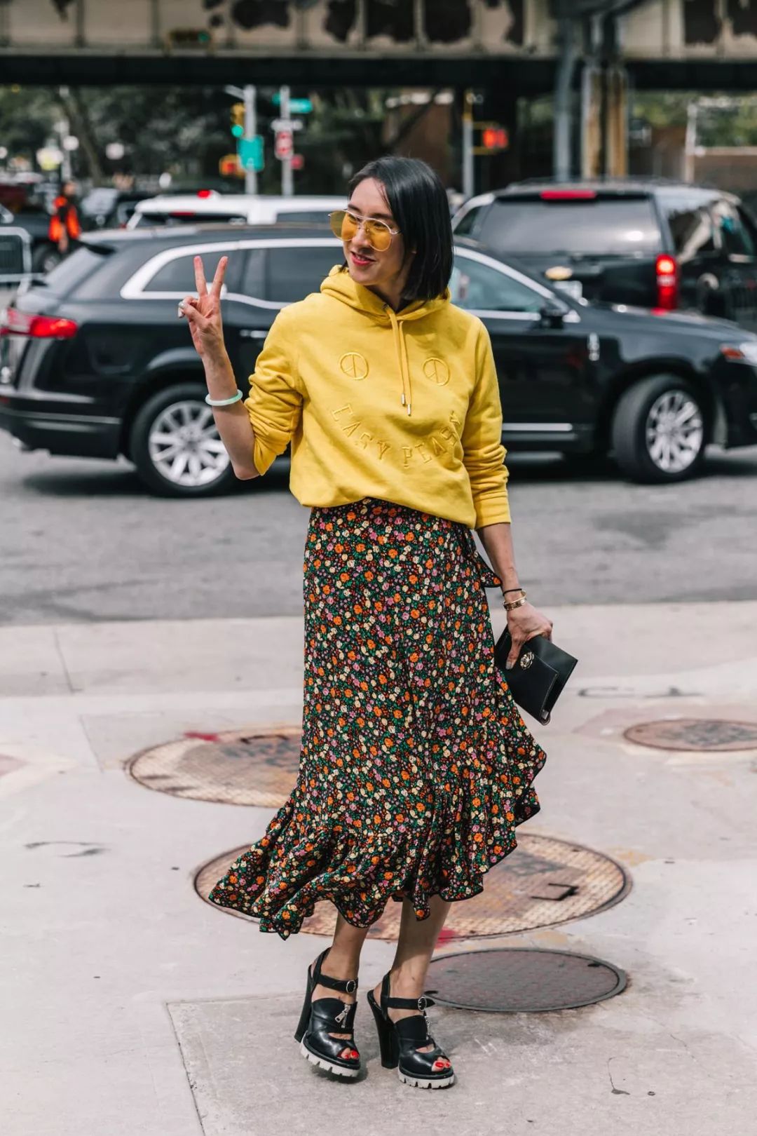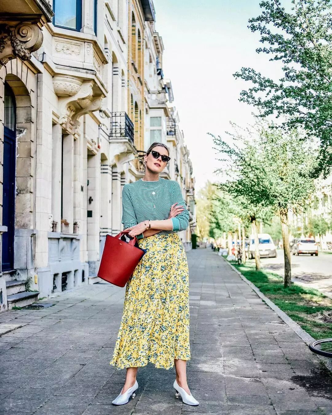 印花半裙相较于连身裙的款式会更适合我们日常穿搭,并且也非常实穿,几乎可以与你的所有上衣做搭配。春天可以与衬衫、外套组cp。