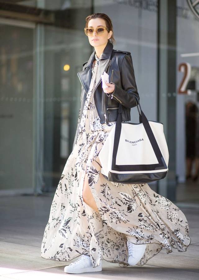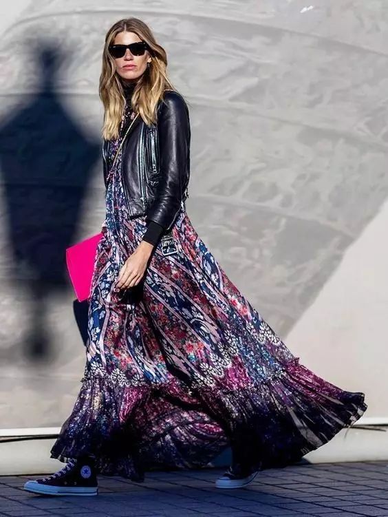 粉色的印花长裙简直美哭,搭配浅蓝色铆钉牛仔短外套+黑色打底裤+黑色单鞋,轻易的时髦着。帅气的机车皮衣搭配印花连衣长裙,脚上配上运动鞋,穿出休闲时髦的娘man风~不喜繁杂只喜简单的宝宝,可以穿上小面积的印花,作为点缀让裙子更有风情,上身一件带绒短夹克,应付春季的气温是绰绰有余了。