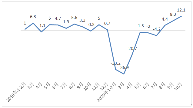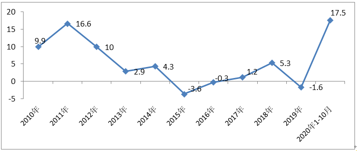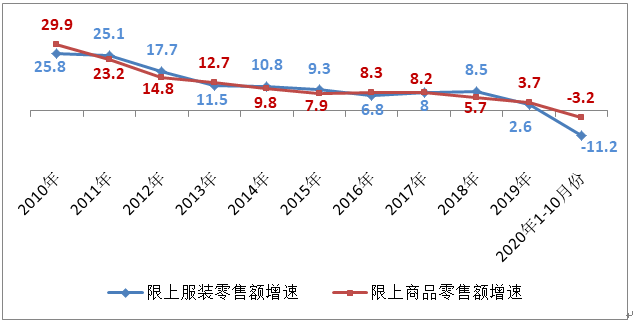 图表1:2010-2020年前10月限额以上服装商品零售额增速(%)