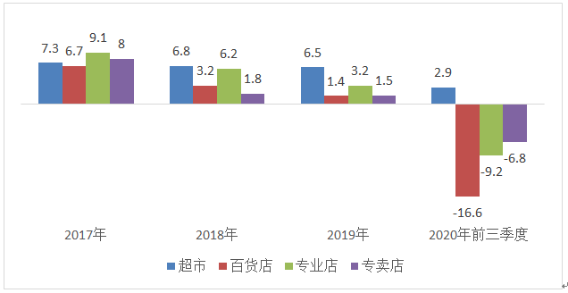 图表2:2017-2020年前10月全国限额以上零售业态增速(%)