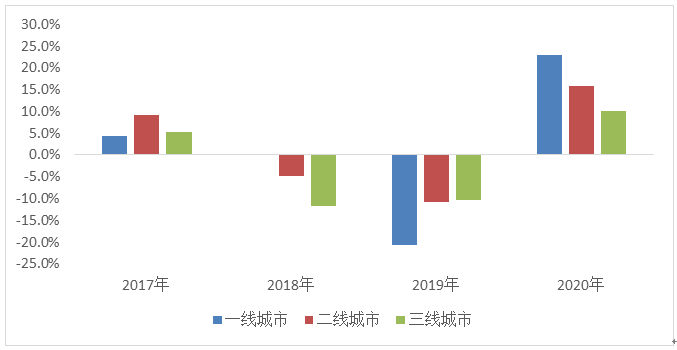 2020年,品牌服装消费呈现出向中心城市聚集的特征,一线城市重点大型零售企业服装消费增速与二、三线城市的差距明显加大。