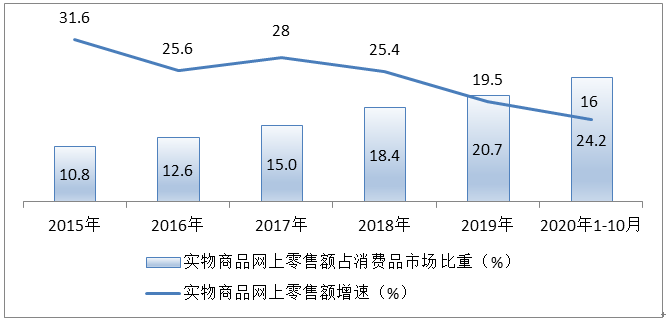 图表4:2015-2020年前10月实物商品网上零售增长情况