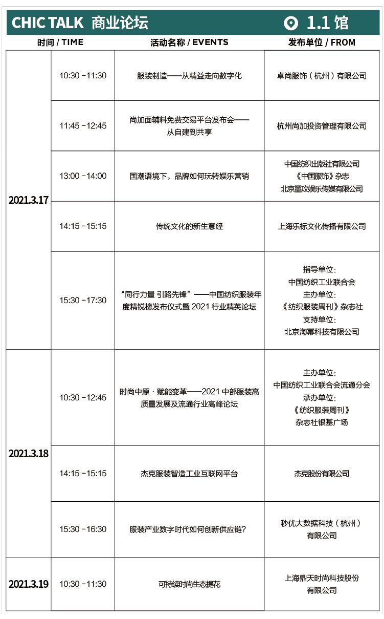 作为历届CHIC的王牌活动,CHIC SHOW(品牌发布秀)、CHIC TALK(商业论坛)、CHIC MATCHIGN(商贸对接会)永远都是最受瞩目的活动。这里不止有时尚潮流的产品展示、精英荟萃的行业探讨,更有切实高效的重要商机。如此重磅的活动日程,绝对不容错过!
