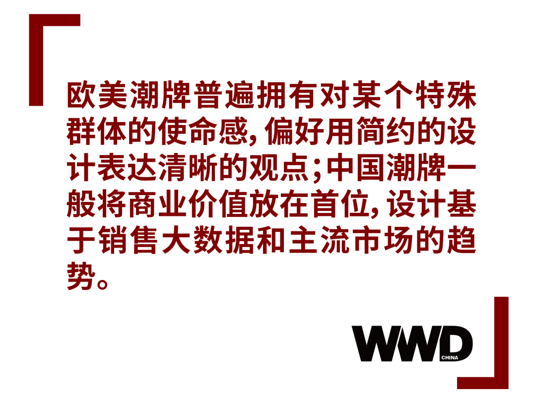 有关中国品牌对“国潮”的认同感问题,新加坡人 Melvin Loh 给出了不同的答案。作为潮牌工厂的老板, Hood by Air、Telfar、Adam Selman 都是他的客户。2016 年,他开始与国潮品牌合作,并开始关注中国潮流市场。Loh 表示,十几年前,中国品牌还会自称来自欧美或日本以抬高溢价,随着中国制造在业内树立了口碑,优秀的中国品牌不再吝于承认国籍,但会更注重市场定位。中国和海外的潮牌同在一家工厂生产,最大的区别不再是品质,而是建立品牌的初衷。欧美潮牌普遍拥有对某个特殊群体的使命感,偏好用简约的设计表达清晰的观点;中国潮牌一般将商业价值放在首位,设计基于销售大数据和主流市场的趋势。