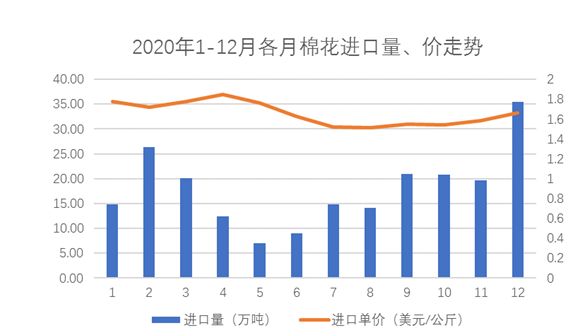 2020年中国棉花累计进口215.9万吨,增长16.6%,连续第四年恢复增长。从全年各月数据看,进口量呈现出明显的“V”形反转,3月以来,由于下游需求下降,进口急速缩减,至5月跌至谷底,当月仅进口7万吨棉花。后伴随需求回暖,进口逐步复苏,进口量放大,12月进口高达35.5万吨,创近五年单月进口量新高。进口均价1651.4美元/吨,创近10年最低。