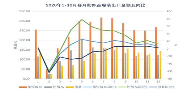 在疫情导致生产受阻、需求下降,以及中美贸易摩擦等因素影响下,2020年中国纺织品服装进口未能恢复增长,全年累计进口236.7亿美元,下降4.1%。下降主要集中在上半年,上半年仅2、3月份由于国内疫情严重,来自海外的捐赠物资猛增带动进口连续增长外,其余月份全部出现两位数下降,上半年累计进口下降9.4%。下半年,国内生产逐步恢复、订单增加,对中间品的需求回升,且人民币汇率从贬值转为持续升值,利于进口,使8-12月连续4个月进口实现增长,下半年累计进口增长4.4%。