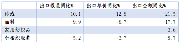 按大宗商品的用途划分,中间品纱线、面料的进口出现量、价齐跌的情况,纱线进口量、价分别下降4.2%和11.3%,面料分别下降28.3%和0.4%。最终消费品针梭织服装依靠单价上涨实现进口额增长0.9%,但进口量下跌12.2%。家用纺织品进口额下降18.4%。
