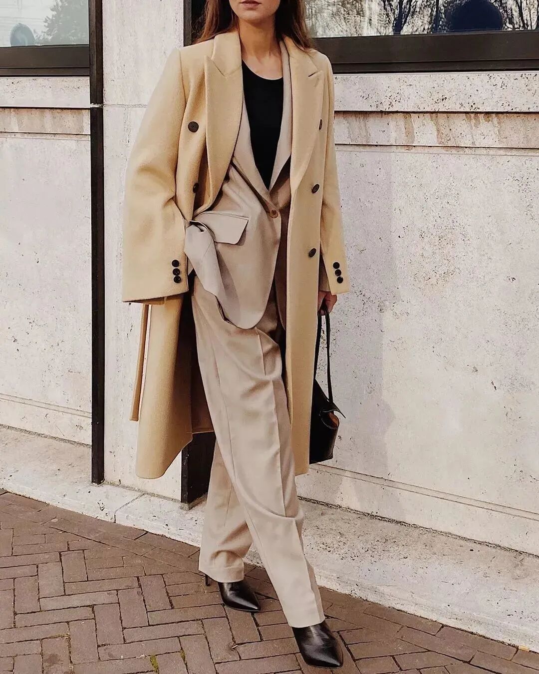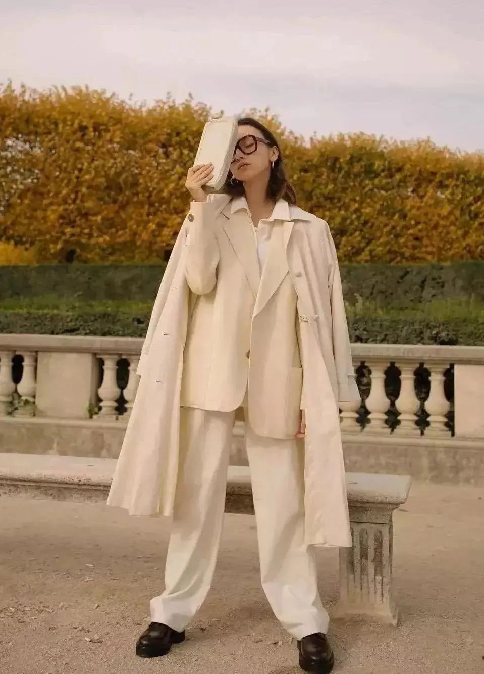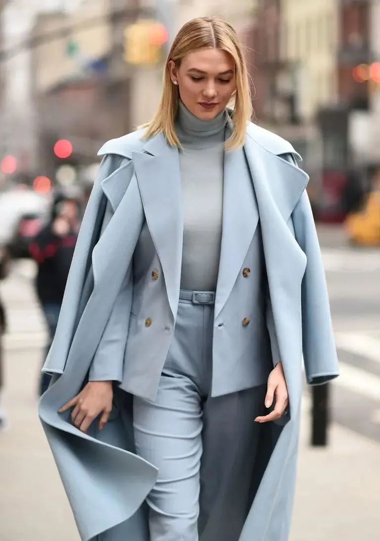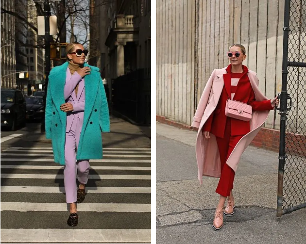时髦女士纷纷穿上垫肩西装,披上气派大衣,和男人一样率性,走在路上,随处可见穿着硬朗的职场女性。国外的时髦人很喜欢全身一个「色 shai」。经典洒脱的“纯色西服”是一直最受大家喜欢的单品,和纯色大衣组合在一起,可谓是神仙般联手了!大衣、西装、裤装这三者中,至少要保证有两件单品的颜色是统一的。这样才能在视觉效果保持上干净整齐,整体也更容易显瘦显高。深色外套,内搭可以选择浅色;浅色外套,内搭可以穿深色,深浅有别,视觉上有个缓冲,不至于太隆重。要是觉得上面这两款太低调、又很有勇气的妹子,可以选择亮色系搭配。