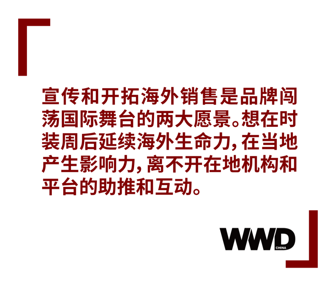 宣传和开拓海外销售是品牌闯荡国际舞台的两大愿景。想在时装周后延续海外生命力,在当地产生影响力,离不开在地机构和平台的助推和互动。