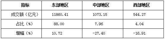 从区域结构看,1-12月,46家重点监测市场中,东部地区专业市场成交额为11860.41亿元,同比上升10.72%,占专业市场总成交额的88.00%;中部地区专业市场成交额为1073.15亿元,同比下降27.40%,占专业市场总成交额的7.96%;西部地区专业市场成交额为544.27亿元,同比下降16.91%,占专业市场总成交额的4.04%。