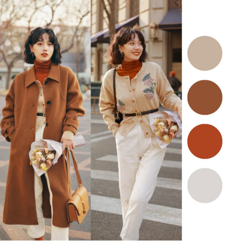 说到底,衣服搭配的原则就是和谐统一又不失层次,在这个基础上,无论是喜欢黄色、蓝色、还是红色、绿色,都能穿出想要的效果。焦糖色就可以搭配米色、皮粉、棕色,都属于同色系搭配法,最起码能够保证统一的色值视觉,在此基础,再通过花纹、款式,去增加质感品位。