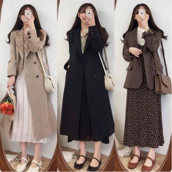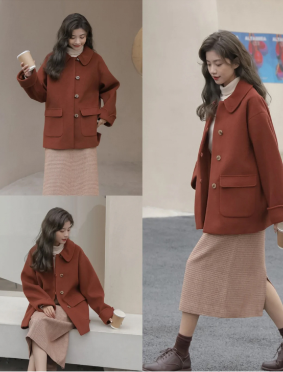 同理,外套的选择,也以同色系为宜,比如白色内搭,可以搭配粉色大衣;米色内搭,搭配焦糖色或者棕色的外套,通过颜色的不同,增加整体搭配的层次感。