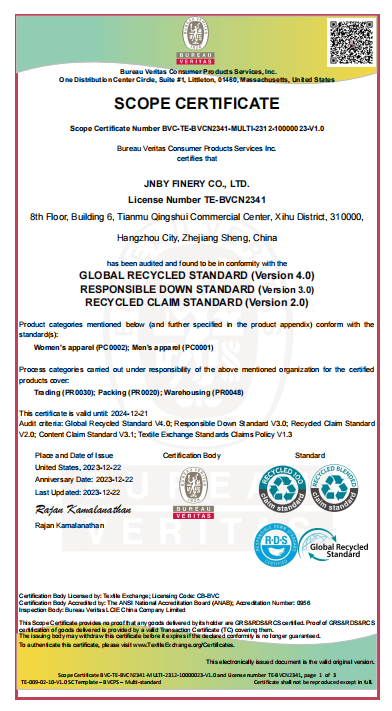 近日,江南布衣荣获全球知名检验认证机构必维集团(Bureau Veritas)颁发的三项可持续发展领域重要国际认证,分别是“RDS责任羽绒标准”、“GRS全球回收标准”和“RCS回收声明标准”认证证书。这标志着江南布衣使用的羽绒以及再生材料符合产销监管链的要求(Chain of Custody),能够为消费者提供具有透明可信、可追溯的产品,在积极践行企业社会责任的同时,也助力行业的绿色环保可持续发展。