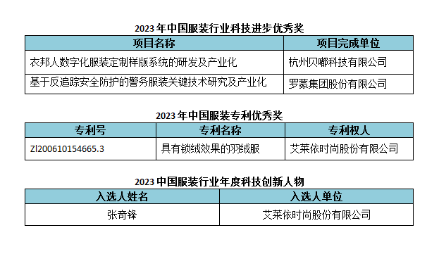 协会会员企业中,罗蒙集团股份有限公司、杭州贝嘟科技有限公司入围“2023年中国服装行业科技进步优秀奖”;艾莱依时尚股份有限公司入围“2023年中国服装专利优秀奖”,同时,该公司张奇锋被评为“2023中国服装行业年度科技创新人物”。诸多权威奖项将进一步激发行业工作者、学者技术探索和创新研究的积极性,树立科技创新典范,提升基础研究和学术研究水平,有力推进行业企业科技进步和数字化转型步伐。