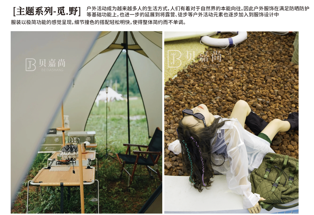 郑:自然与本真。疫情后青少年焦虑和压力日渐增长,疗愈经济已经成为了一种新的经济现象,而亲近大自然一直都是最好的疗愈方式,逃离城市,探索自然活力是本季精神主题,时尚与自然之色相交辉映,赋予着装更加生动巧妙的活力,流淌出怡然自得的精神价值。去走一走,做户外氧气女孩,去享受夏日的自然之境。