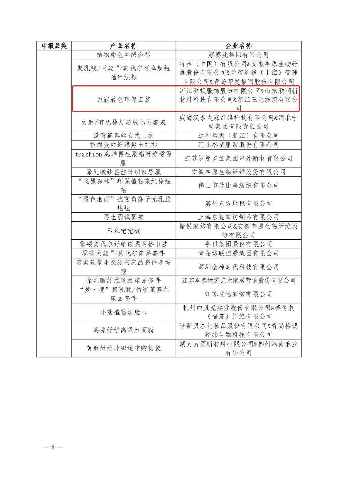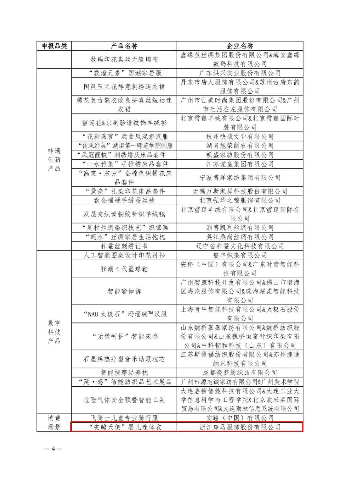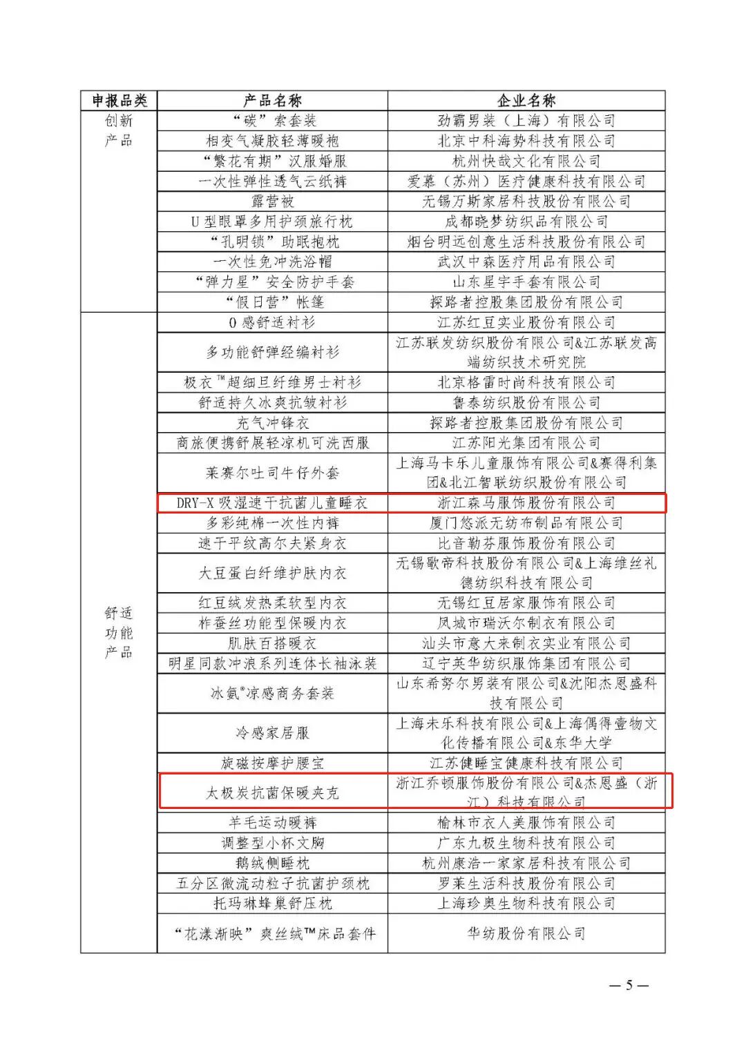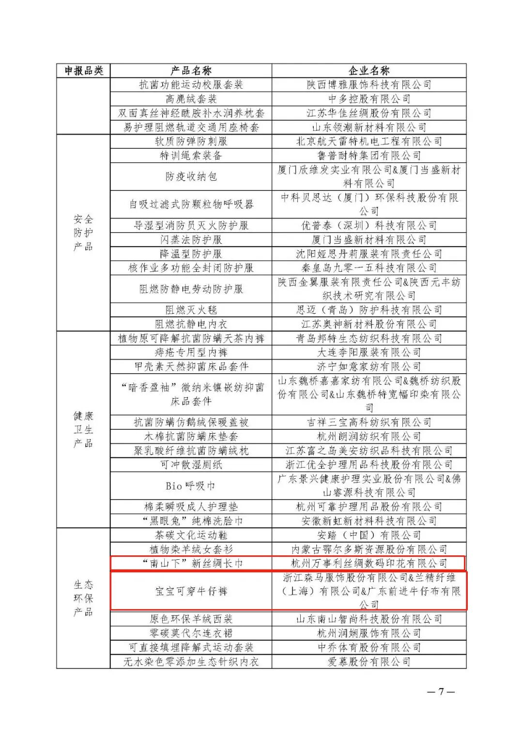 协会会员单位浙江森马服饰股份有限公司的“安睡天使”婴儿连体衣、宝宝可穿牛仔裤和DRY-X吸湿速干抗菌儿童睡衣分别荣获消费场景创新产品、生态环保产品和舒适功能产品称号;浙江乔顿服饰股份有限公司的太极炭抗菌保暖夹克、原液着色环保工装分别获舒适功能产品和生态环保产品称号;杭州万事利丝绸数码印花有限公司的“南山下”新丝绸长巾获生态环保产品称号。