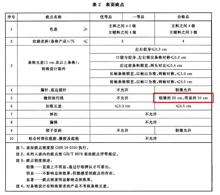 新标准对“缝纫油污线”的合格品判定要求描述做出了调整,其他无变化。