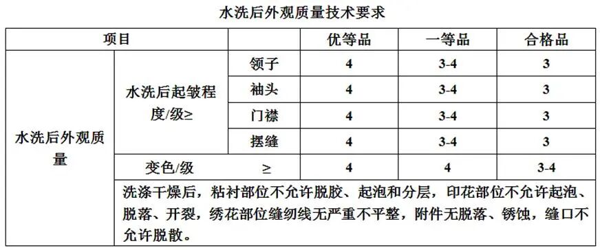 新标准中增加了水洗后外观质量的考核指标,将旧标准原有的水洗后起皱程度项目列入该项目中。