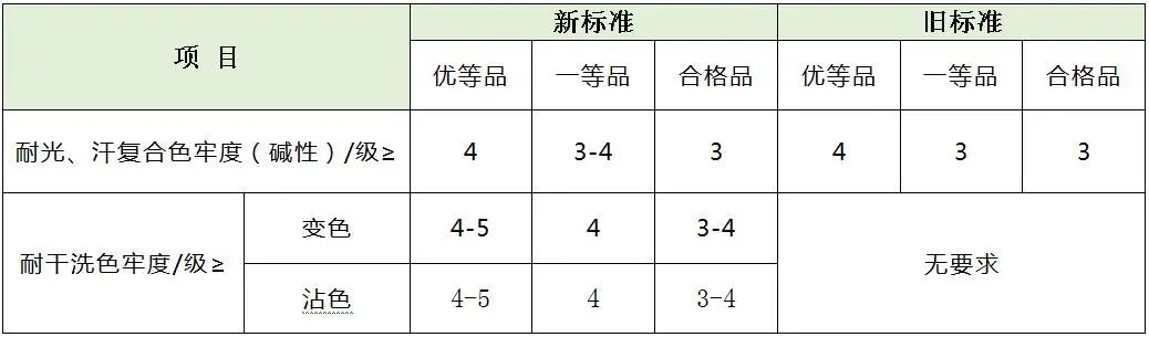 修改了耐光、汗复合色牢度(碱性)一等品的指标要求。