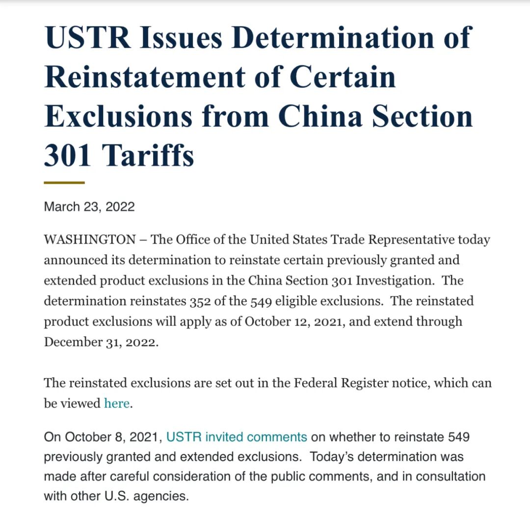 当地时间3月23日,美国贸易代表办公室发布公告称,针对以所谓“301条款”对华加征的关税中,已恢复部分中国进口商品的关税豁免,此次关税豁免涉及此前549项待定产品中的352项。