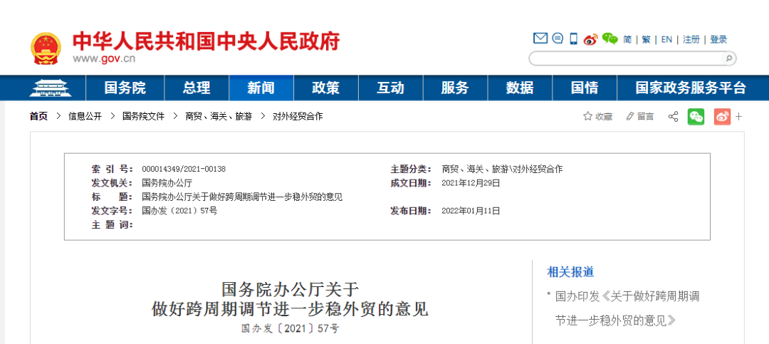 中国政府网1月11日消息,国务院办公厅日前印发《关于做好跨周期调节进一步稳外贸的意见》,提出15条政策措施进一步稳外贸。