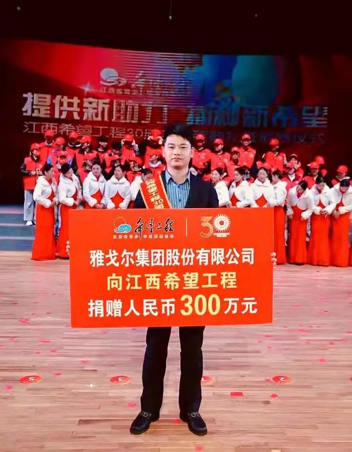 为践行“让人人变得更美好”的公司使命,继续履行捐资助学回馈社会的责任,雅戈尔集团决定自今年起,每年向江西省青少年基金会捐款30万元,助力希望小学发展建设及人才培养,捐助期为10年,合计总金额300万元。