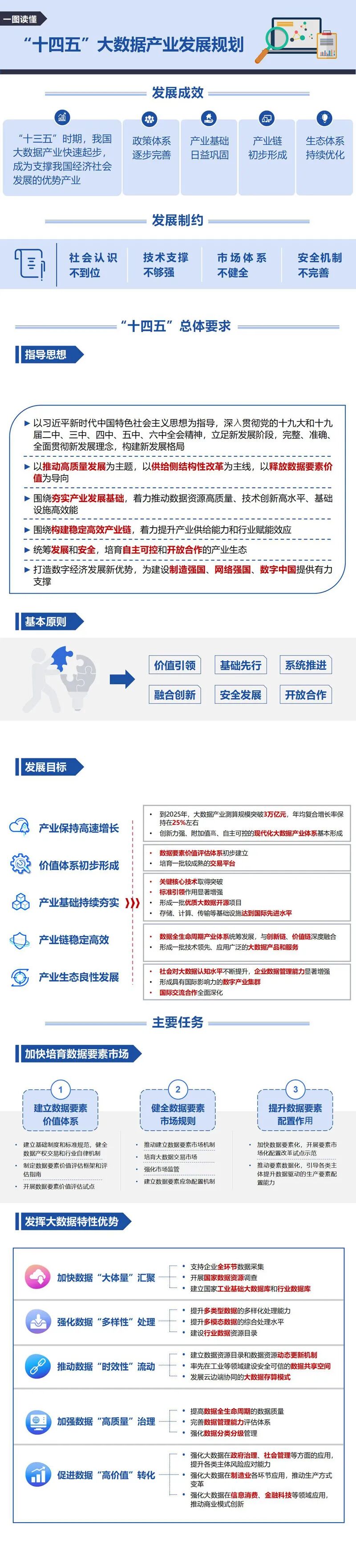 近日,工业和信息化部发布了《“十四五”大数据产业发展规划》(以下简称《规划》)。《规划》提出,到2025年,大数据产业保持高速增长,价值体系初步形成,产业基础持续夯实,产业链稳定高效,产业生态良性发展,创新力强、附加值高、自主可控的现代化大数据产业体系基本形成。其中,大数据产业测算规模突破3万亿元,年均复合增长率保持在25%左右。