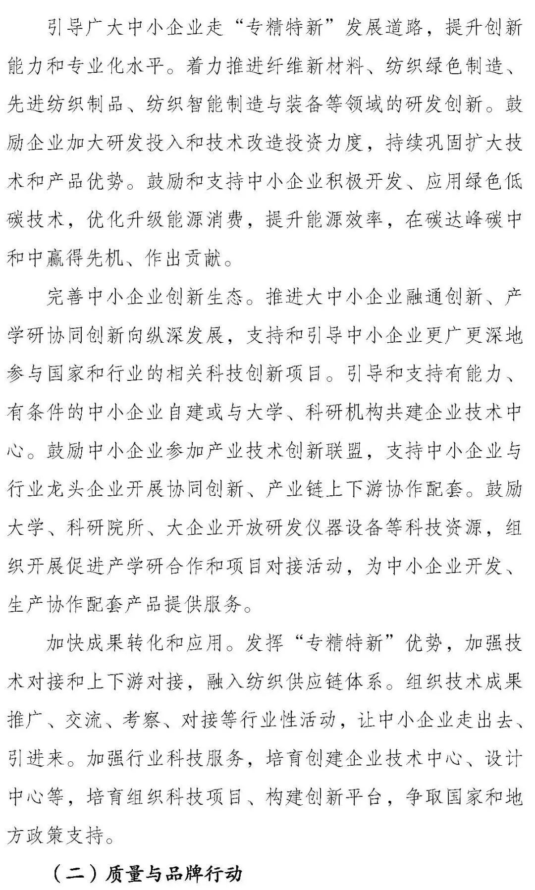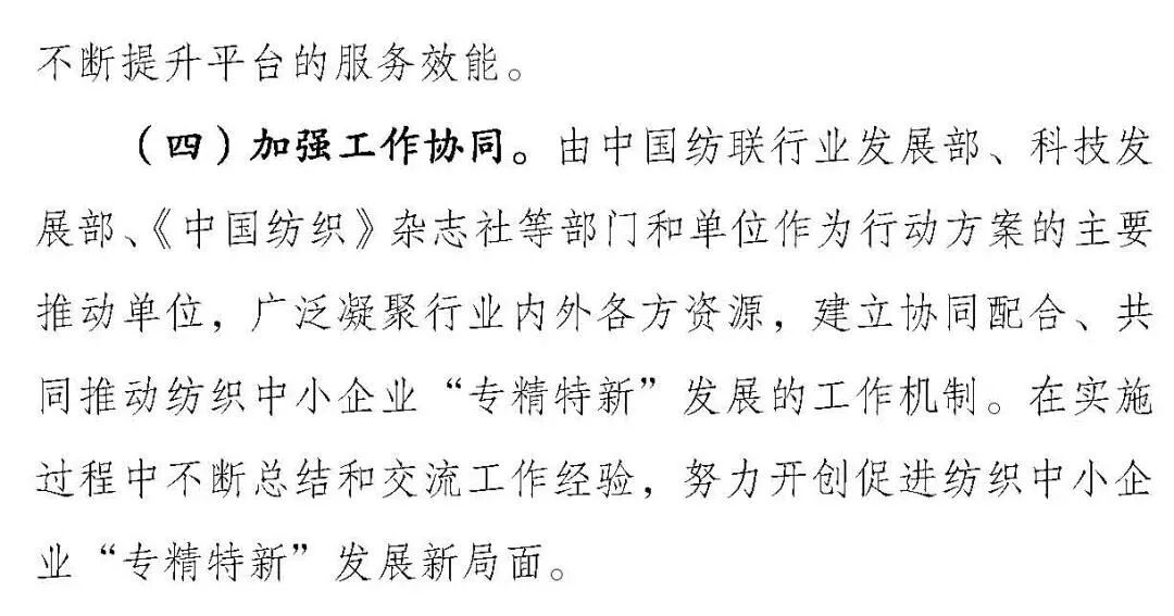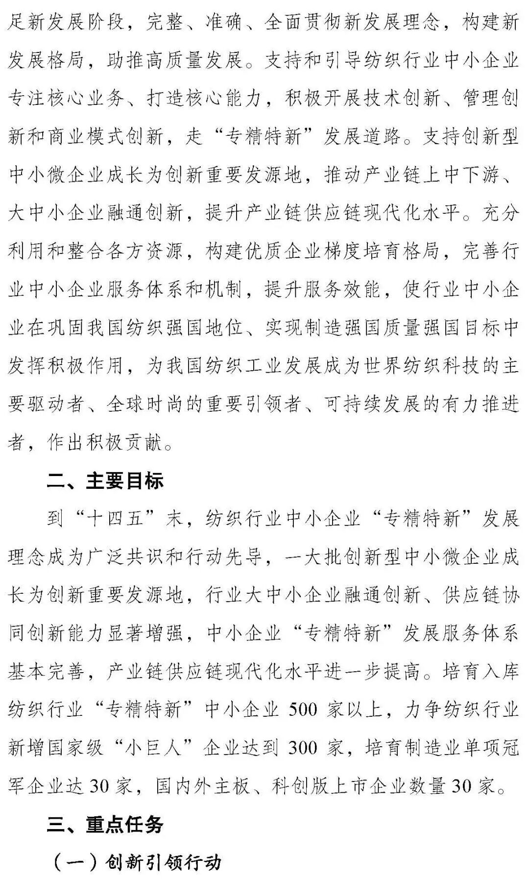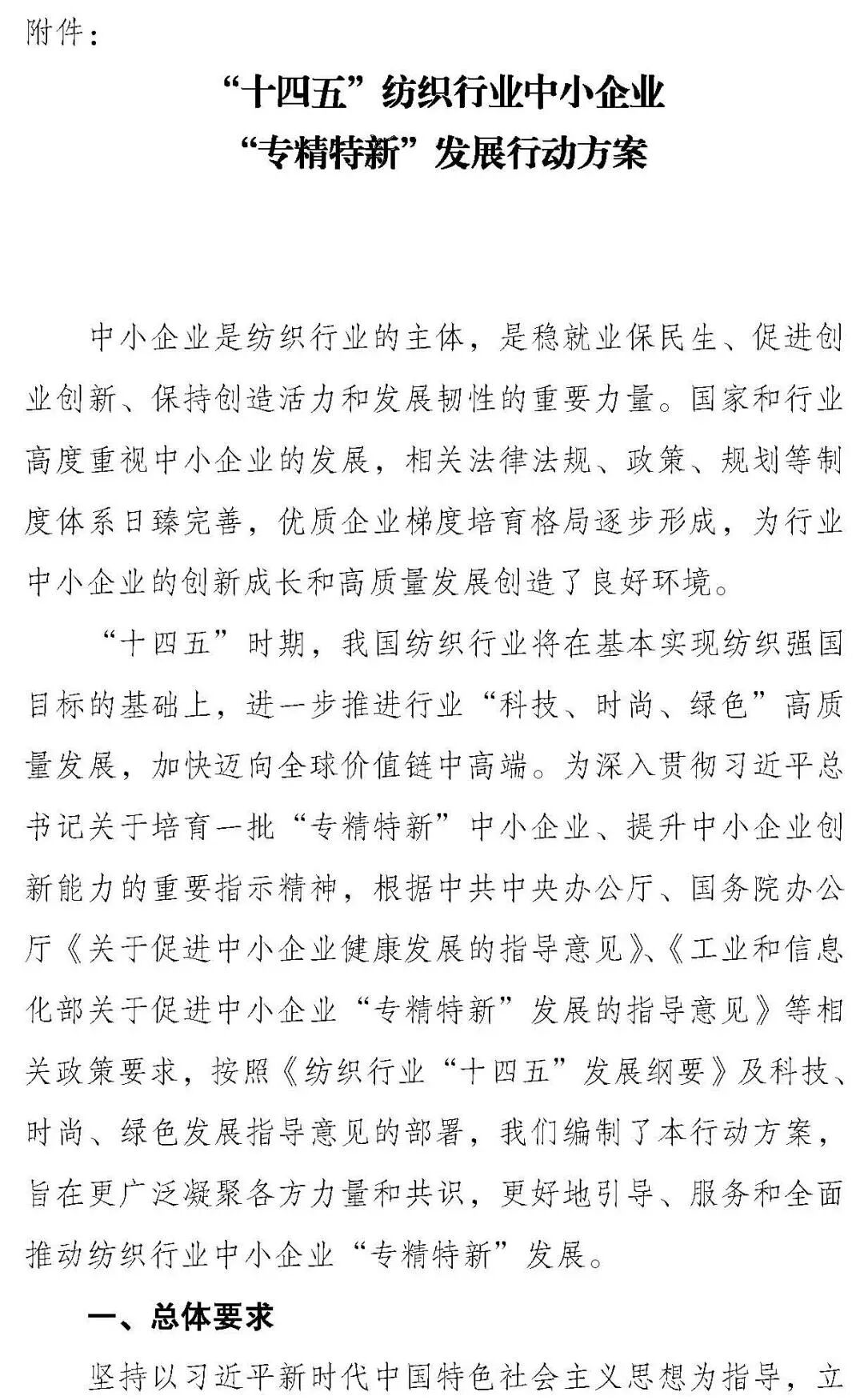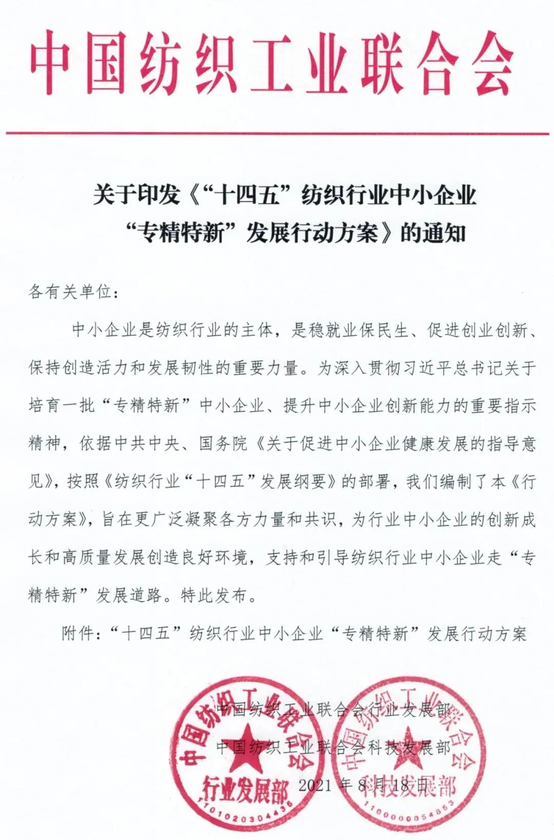 8月18日,中国纺织工业联合会行业发展部与科技发展部发布《“十四五”纺织行业中小企业“专精特新”发展行动方案》,旨在更广泛凝聚各方力量和共识,为行业中小企业的创新成长和高质量发展创造良好环境,支持和引导纺织行业中小企业走“专精特新”发展道路。