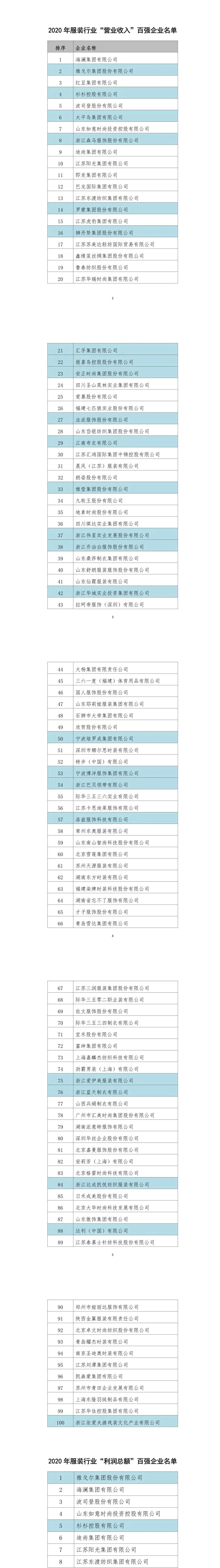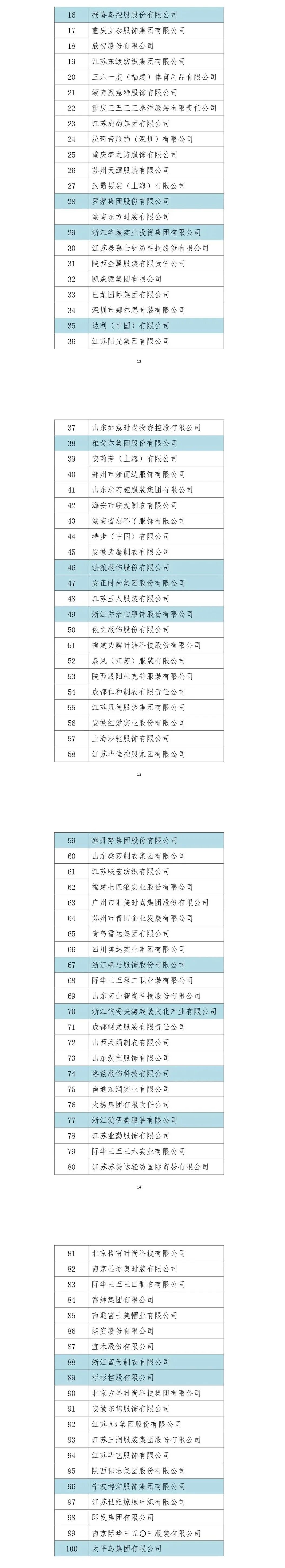 我省服装行业在过去一年中积极应对各种风险和挑战,以供给侧结构性改革为主线,着力推进科技进步和模式创新,行业整体保持平稳发展,实现由规模发展向质量发展的转变。协会始终致力于推动“浙江服装”区域品牌的知名度、助力企业提升核心竞争力。此次上榜的24家浙江企业,是我省服装产业创新发展的代表性力量和榜样!恭喜上榜企业!以下附上百强企业名单。
