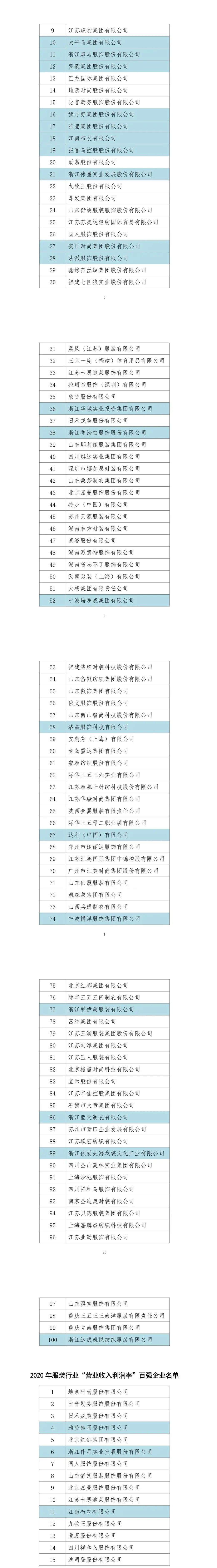 协会副会长单位雅戈尔集团控股有限公司、杉杉控股有限公司、太平鸟集团有限公司、浙江森马服饰股份有限公司等4家企业进入“营业收入”榜单前十。