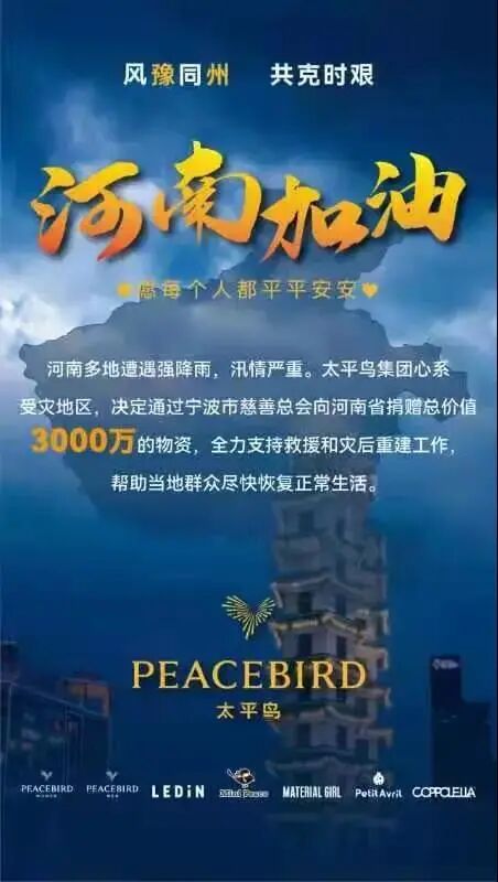 近日,河南遭遇极端降雨天气,多地连降暴雨引发严重洪涝灾害。面对灾情,浙江省服装行业协会多家会员企业纷纷采取行动,及时捐赠物资支援河南受灾地区!(汇总信息截止7月27日)