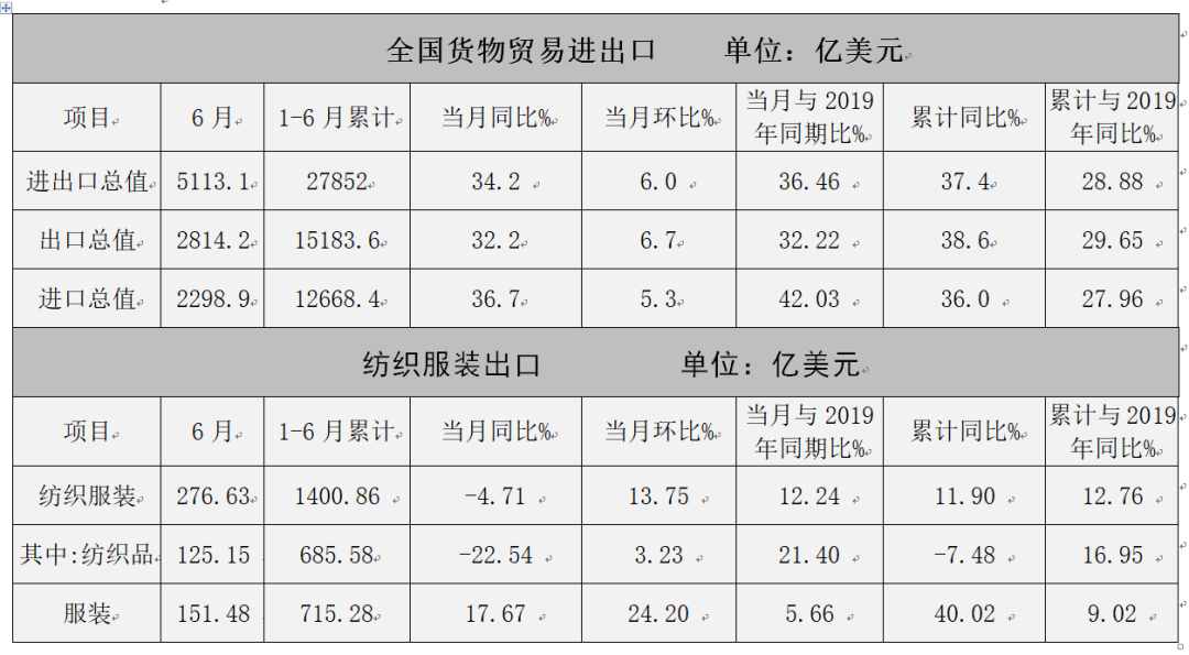 2021年1-6月,纺织服装累计出口1400.86亿美元,增长11.90%,比2019年增长12.76%,其中纺织品出口685.58亿美元,下降7.48%,比2019年增长16.95%,服装出口715.28亿美元,增长40.02%,比2019年增长9.02%。