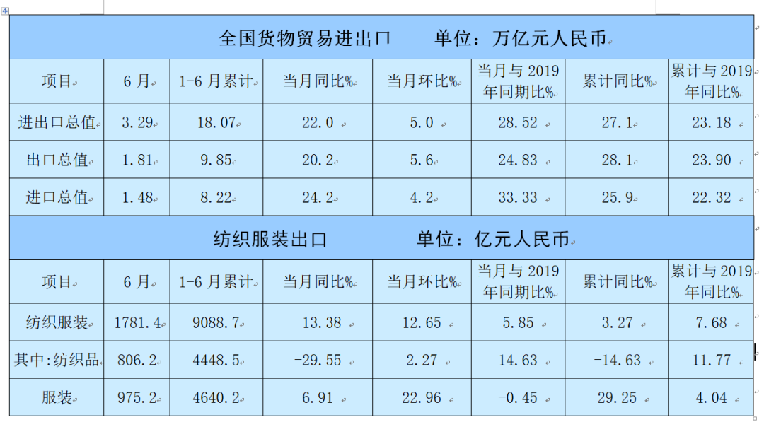 6月,纺织服装出口1781.4亿元,下降13.38%,环比增长12.65%,其中纺织品出口806.2亿元,下降29.55%,环比增长2.27%,服装出口975.2亿元,增长6.91%,环比增长22.96%。