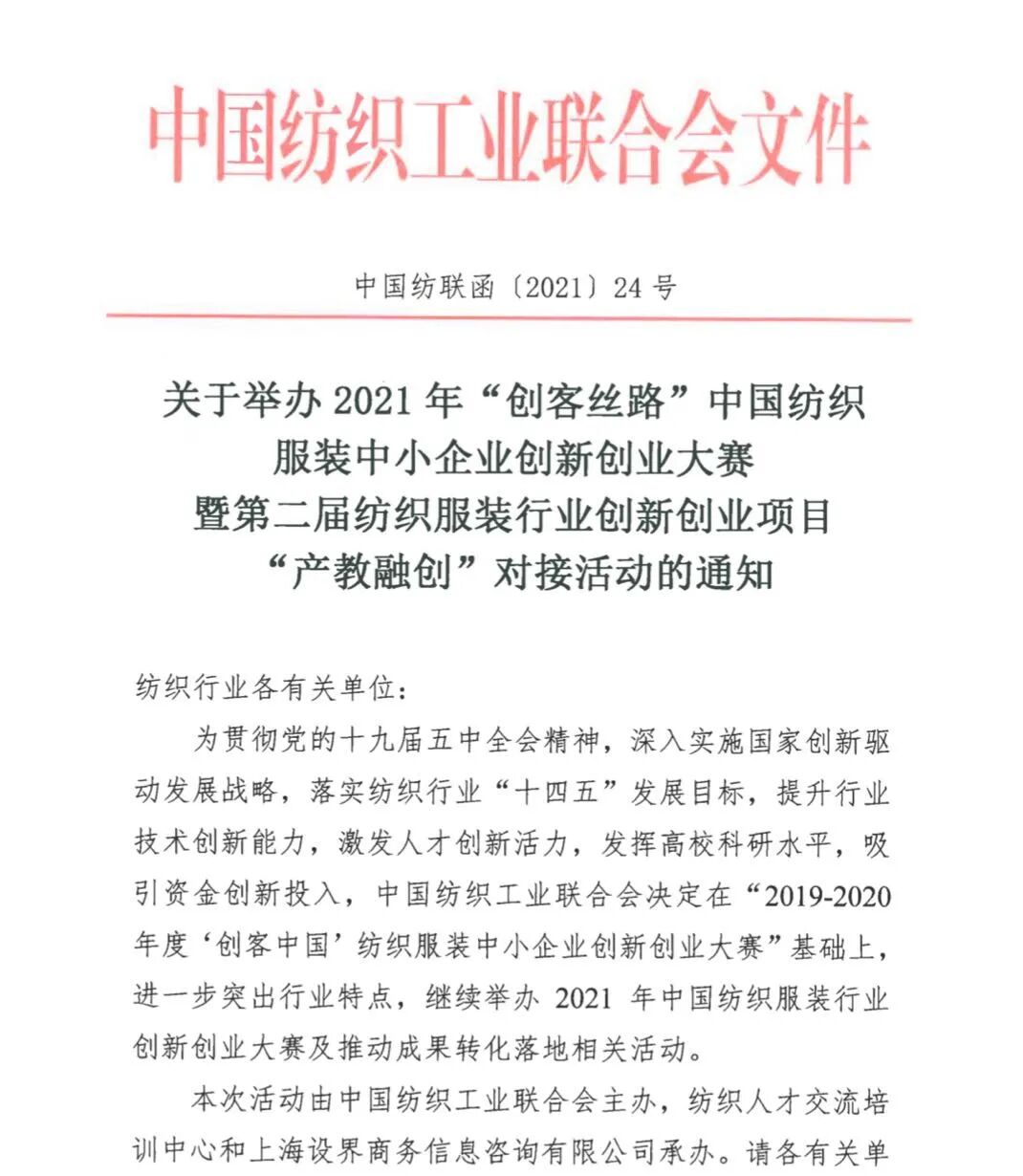 为落实纺织行业“十四五”发展目标,加快建设具有科技创新为核心竞争力的纺织强国,以创新驱动、高质量供给引领和创造新需求,中国纺织工业联合会年初工作部署,制订了2021年“创客丝路”中国纺织服装中小企业创新创业大赛暨第二届纺织服装行业创新创业项目“产教融创”对接活动方案。