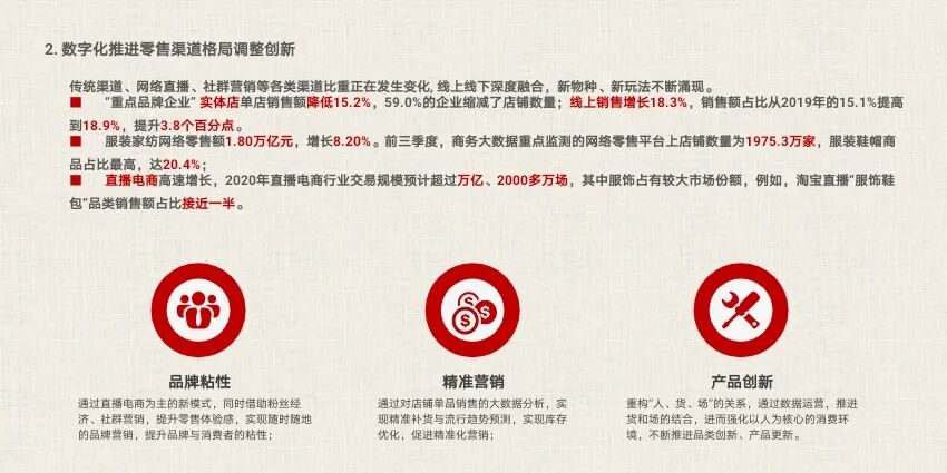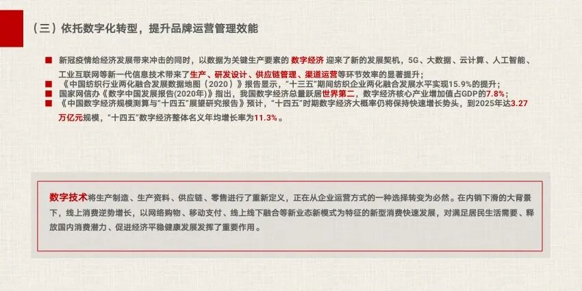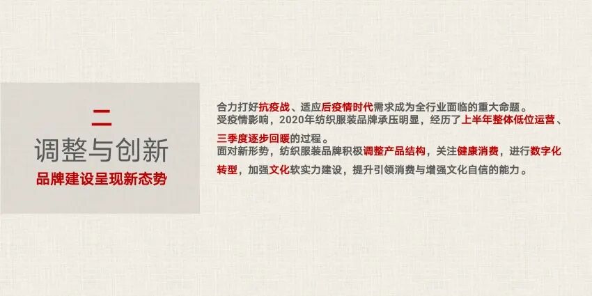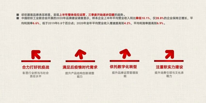 5月11日,2021中国品牌发展国际论坛——纺织服装行业品牌建设分论坛在上海举行,会上发布了《2020年中国纺织服装品牌发展报告》。报告从挑战与机遇、调整与创新、强化与提升三大部分着手,基于系统翔实的品牌建设数据调查与大量典型的案例分析,着眼全球视野,深度剖析了新时代下中国纺织服装品牌面临的新环境,梳理提炼了品牌建设呈现的新态势,并指出了“十四五”时期全行业品牌建设工作的新方向。
