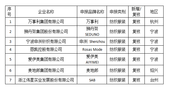 为推动我省外贸高质量发展,根据《浙江省商务厅关于开展2020年度“浙江出口名牌”培育工作的通知》要求,省商务厅厅从去年8月启动了“浙江出口名牌”申报评审工作,对2017年度“浙江出口名牌”进行到期复核,并新培育一批符合条件的企业。经过地市推荐、专题审核、省级部门意见征求等审核程序,拟认定2020年度“浙江出口名牌”363个(新增91个,复核272个)。万事利、狮丹努、宁波申洲针织等7家协会会员企业品牌通过复核,荣登名牌公示名单。