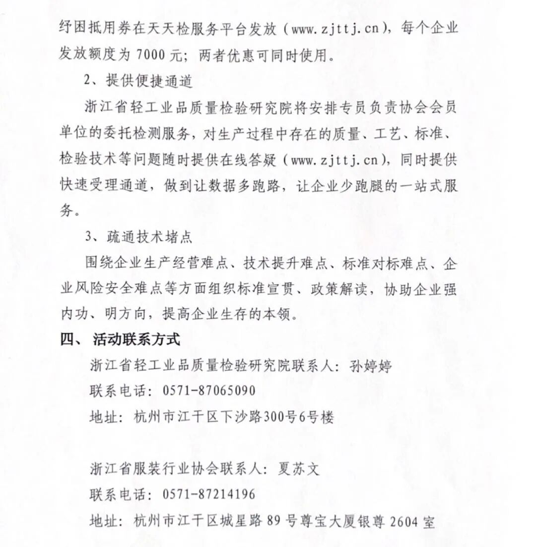 凡是本协会会员企业,如有检测需求,尽快报名至浙江省服装行业协会秘书处,并同时在天天检服务平台(www.zjttj.cn)注册。每家会员企业可获得额度为7000元的检测抵用券(注册成功即可得5000元券,9月底前再发放2000元至注册账户),可与优惠套餐同时使用。平台将安排专员负责会员单位的委托检测服务,提供快速受理通道。同时,将围绕国家标准、风险安全、技术提升等方面组织标准宣贯、政策解读等活动,助力企业提升质量管控体系。具体内容通知如下: